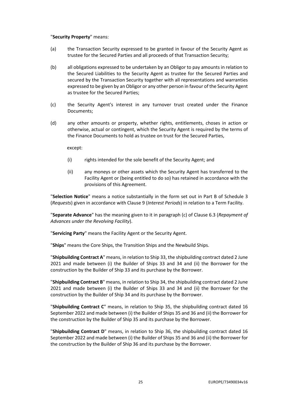 25 EUROPE/73490034v16 "Security Property" means: (a) the Transaction Security expressed to be granted in favour of the Security Agent as trustee for the Secured Parties and all proceeds of that Transaction Security; (b) all obligations expressed to be undertaken by an Obligor to pay amounts in relation to the Secured Liabilities to the Security Agent as trustee for the Secured Parties and secured by the Transaction Security together with all representations and warranties expressed to be given by an Obligor or any other person in favour of the Security Agent as trustee for the Secured Parties; (c) the Security Agent's interest in any turnover trust created under the Finance Documents; (d) any other amounts or property, whether rights, entitlements, choses in action or otherwise, actual or contingent, which the Security Agent is required by the terms of the Finance Documents to hold as trustee on trust for the Secured Parties, except: (i) rights intended for the sole benefit of the Security Agent; and (ii) any moneys or other assets which the Security Agent has transferred to the Facility Agent or (being entitled to do so) has retained in accordance with the provisions of this Agreement. "Selection Notice" means a notice substantially in the form set out in Part B of Schedule 3 (Requests) given in accordance with Clause 9 (Interest Periods) in relation to a Term Facility. "Separate Advance" has the meaning given to it in paragraph (c) of Clause 6.3 (Repayment of Advances under the Revolving Facility). "Servicing Party" means the Facility Agent or the Security Agent. "Ships" means the Core Ships, the Transition Ships and the Newbuild Ships. "Shipbuilding Contract A" means, in relation to Ship 33, the shipbuilding contract dated 2 June 2021 and made between (i) the Builder of Ships 33 and 34 and (ii) the Borrower for the construction by the Builder of Ship 33 and its purchase by the Borrower. "Shipbuilding Contract B" means, in relation to Ship 34, the shipbuilding contract dated 2 June 2021 and made between (i) the Builder of Ships 33 and 34 and (ii) the Borrower for the construction by the Builder of Ship 34 and its purchase by the Borrower. "Shipbuilding Contract C" means, in relation to Ship 35, the shipbuilding contract dated 16 September 2022 and made between (i) the Builder of Ships 35 and 36 and (ii) the Borrower for the construction by the Builder of Ship 35 and its purchase by the Borrower. "Shipbuilding Contract D" means, in relation to Ship 36, the shipbuilding contract dated 16 September 2022 and made between (i) the Builder of Ships 35 and 36 and (ii) the Borrower for the construction by the Builder of Ship 36 and its purchase by the Borrower.