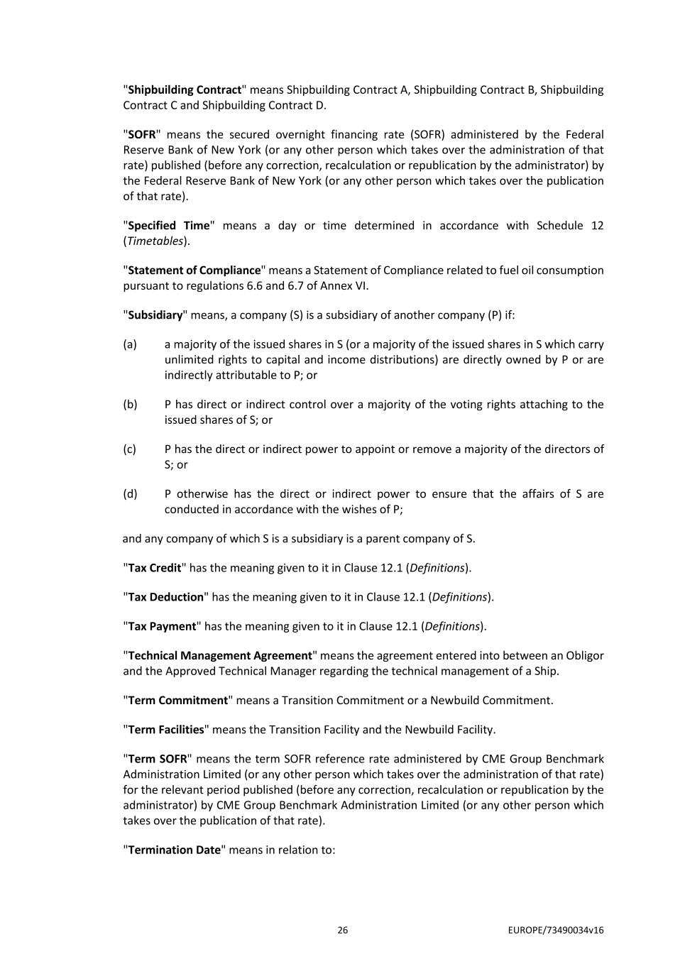 26 EUROPE/73490034v16 "Shipbuilding Contract" means Shipbuilding Contract A, Shipbuilding Contract B, Shipbuilding Contract C and Shipbuilding Contract D. "SOFR" means the secured overnight financing rate (SOFR) administered by the Federal Reserve Bank of New York (or any other person which takes over the administration of that rate) published (before any correction, recalculation or republication by the administrator) by the Federal Reserve Bank of New York (or any other person which takes over the publication of that rate). "Specified Time" means a day or time determined in accordance with Schedule 12 (Timetables). "Statement of Compliance" means a Statement of Compliance related to fuel oil consumption pursuant to regulations 6.6 and 6.7 of Annex VI. "Subsidiary" means, a company (S) is a subsidiary of another company (P) if: (a) a majority of the issued shares in S (or a majority of the issued shares in S which carry unlimited rights to capital and income distributions) are directly owned by P or are indirectly attributable to P; or (b) P has direct or indirect control over a majority of the voting rights attaching to the issued shares of S; or (c) P has the direct or indirect power to appoint or remove a majority of the directors of S; or (d) P otherwise has the direct or indirect power to ensure that the affairs of S are conducted in accordance with the wishes of P; and any company of which S is a subsidiary is a parent company of S. "Tax Credit" has the meaning given to it in Clause 12.1 (Definitions). "Tax Deduction" has the meaning given to it in Clause 12.1 (Definitions). "Tax Payment" has the meaning given to it in Clause 12.1 (Definitions). "Technical Management Agreement" means the agreement entered into between an Obligor and the Approved Technical Manager regarding the technical management of a Ship. "Term Commitment" means a Transition Commitment or a Newbuild Commitment. "Term Facilities" means the Transition Facility and the Newbuild Facility. "Term SOFR" means the term SOFR reference rate administered by CME Group Benchmark Administration Limited (or any other person which takes over the administration of that rate) for the relevant period published (before any correction, recalculation or republication by the administrator) by CME Group Benchmark Administration Limited (or any other person which takes over the publication of that rate). "Termination Date" means in relation to: