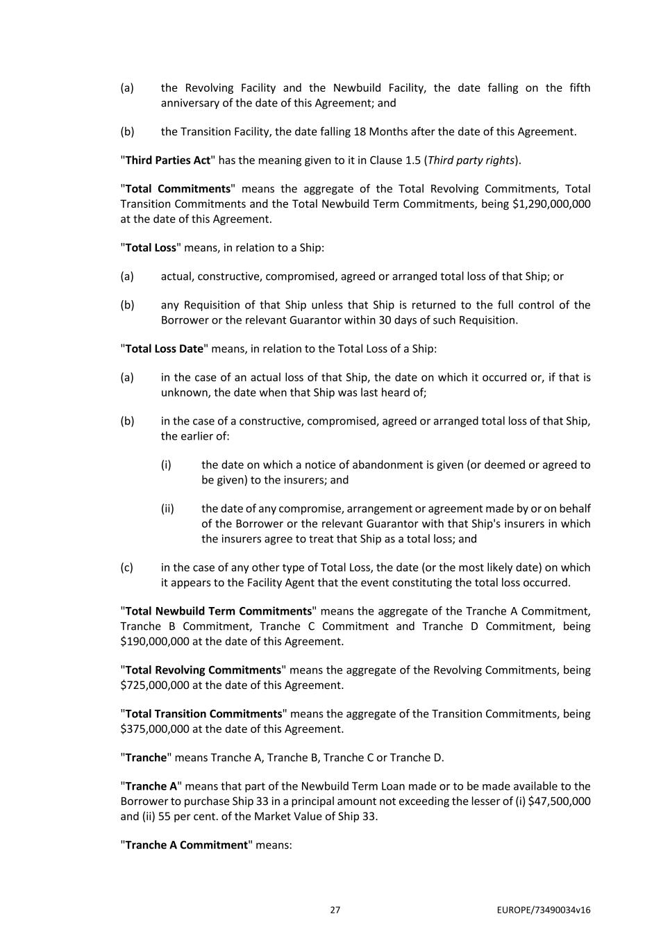 27 EUROPE/73490034v16 (a) the Revolving Facility and the Newbuild Facility, the date falling on the fifth anniversary of the date of this Agreement; and (b) the Transition Facility, the date falling 18 Months after the date of this Agreement. "Third Parties Act" has the meaning given to it in Clause 1.5 (Third party rights). "Total Commitments" means the aggregate of the Total Revolving Commitments, Total Transition Commitments and the Total Newbuild Term Commitments, being $1,290,000,000 at the date of this Agreement. "Total Loss" means, in relation to a Ship: (a) actual, constructive, compromised, agreed or arranged total loss of that Ship; or (b) any Requisition of that Ship unless that Ship is returned to the full control of the Borrower or the relevant Guarantor within 30 days of such Requisition. "Total Loss Date" means, in relation to the Total Loss of a Ship: (a) in the case of an actual loss of that Ship, the date on which it occurred or, if that is unknown, the date when that Ship was last heard of; (b) in the case of a constructive, compromised, agreed or arranged total loss of that Ship, the earlier of: (i) the date on which a notice of abandonment is given (or deemed or agreed to be given) to the insurers; and (ii) the date of any compromise, arrangement or agreement made by or on behalf of the Borrower or the relevant Guarantor with that Ship's insurers in which the insurers agree to treat that Ship as a total loss; and (c) in the case of any other type of Total Loss, the date (or the most likely date) on which it appears to the Facility Agent that the event constituting the total loss occurred. "Total Newbuild Term Commitments" means the aggregate of the Tranche A Commitment, Tranche B Commitment, Tranche C Commitment and Tranche D Commitment, being $190,000,000 at the date of this Agreement. "Total Revolving Commitments" means the aggregate of the Revolving Commitments, being $725,000,000 at the date of this Agreement. "Total Transition Commitments" means the aggregate of the Transition Commitments, being $375,000,000 at the date of this Agreement. "Tranche" means Tranche A, Tranche B, Tranche C or Tranche D. "Tranche A" means that part of the Newbuild Term Loan made or to be made available to the Borrower to purchase Ship 33 in a principal amount not exceeding the lesser of (i) $47,500,000 and (ii) 55 per cent. of the Market Value of Ship 33. "Tranche A Commitment" means: