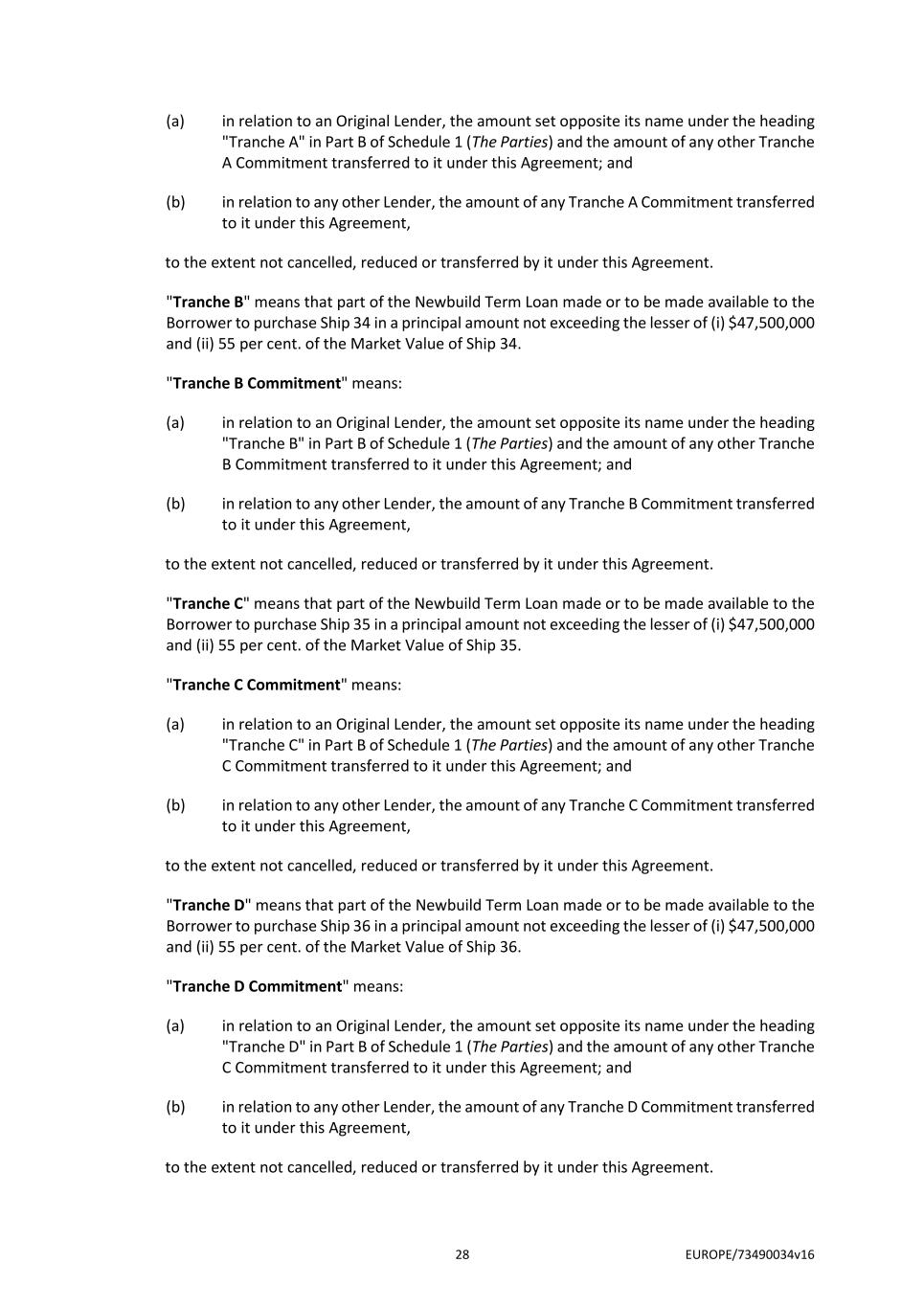 28 EUROPE/73490034v16 (a) in relation to an Original Lender, the amount set opposite its name under the heading "Tranche A" in Part B of Schedule 1 (The Parties) and the amount of any other Tranche A Commitment transferred to it under this Agreement; and (b) in relation to any other Lender, the amount of any Tranche A Commitment transferred to it under this Agreement, to the extent not cancelled, reduced or transferred by it under this Agreement. "Tranche B" means that part of the Newbuild Term Loan made or to be made available to the Borrower to purchase Ship 34 in a principal amount not exceeding the lesser of (i) $47,500,000 and (ii) 55 per cent. of the Market Value of Ship 34. "Tranche B Commitment" means: (a) in relation to an Original Lender, the amount set opposite its name under the heading "Tranche B" in Part B of Schedule 1 (The Parties) and the amount of any other Tranche B Commitment transferred to it under this Agreement; and (b) in relation to any other Lender, the amount of any Tranche B Commitment transferred to it under this Agreement, to the extent not cancelled, reduced or transferred by it under this Agreement. "Tranche C" means that part of the Newbuild Term Loan made or to be made available to the Borrower to purchase Ship 35 in a principal amount not exceeding the lesser of (i) $47,500,000 and (ii) 55 per cent. of the Market Value of Ship 35. "Tranche C Commitment" means: (a) in relation to an Original Lender, the amount set opposite its name under the heading "Tranche C" in Part B of Schedule 1 (The Parties) and the amount of any other Tranche C Commitment transferred to it under this Agreement; and (b) in relation to any other Lender, the amount of any Tranche C Commitment transferred to it under this Agreement, to the extent not cancelled, reduced or transferred by it under this Agreement. "Tranche D" means that part of the Newbuild Term Loan made or to be made available to the Borrower to purchase Ship 36 in a principal amount not exceeding the lesser of (i) $47,500,000 and (ii) 55 per cent. of the Market Value of Ship 36. "Tranche D Commitment" means: (a) in relation to an Original Lender, the amount set opposite its name under the heading "Tranche D" in Part B of Schedule 1 (The Parties) and the amount of any other Tranche C Commitment transferred to it under this Agreement; and (b) in relation to any other Lender, the amount of any Tranche D Commitment transferred to it under this Agreement, to the extent not cancelled, reduced or transferred by it under this Agreement.