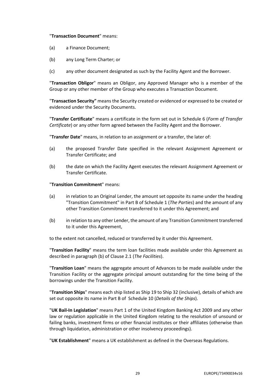 29 EUROPE/73490034v16 "Transaction Document" means: (a) a Finance Document; (b) any Long Term Charter; or (c) any other document designated as such by the Facility Agent and the Borrower. "Transaction Obligor" means an Obligor, any Approved Manager who is a member of the Group or any other member of the Group who executes a Transaction Document. "Transaction Security" means the Security created or evidenced or expressed to be created or evidenced under the Security Documents. "Transfer Certificate" means a certificate in the form set out in Schedule 6 (Form of Transfer Certificate) or any other form agreed between the Facility Agent and the Borrower. "Transfer Date" means, in relation to an assignment or a transfer, the later of: (a) the proposed Transfer Date specified in the relevant Assignment Agreement or Transfer Certificate; and (b) the date on which the Facility Agent executes the relevant Assignment Agreement or Transfer Certificate. "Transition Commitment" means: (a) in relation to an Original Lender, the amount set opposite its name under the heading "Transition Commitment" in Part B of Schedule 1 (The Parties) and the amount of any other Transition Commitment transferred to it under this Agreement; and (b) in relation to any other Lender, the amount of any Transition Commitment transferred to it under this Agreement, to the extent not cancelled, reduced or transferred by it under this Agreement. "Transition Facility" means the term loan facilities made available under this Agreement as described in paragraph (b) of Clause 2.1 (The Facilities). "Transition Loan" means the aggregate amount of Advances to be made available under the Transition Facility or the aggregate principal amount outstanding for the time being of the borrowings under the Transition Facility. "Transition Ships" means each ship listed as Ship 19 to Ship 32 (inclusive), details of which are set out opposite its name in Part B of Schedule 10 (Details of the Ships). "UK Bail-In Legislation" means Part 1 of the United Kingdom Banking Act 2009 and any other law or regulation applicable in the United Kingdom relating to the resolution of unsound or failing banks, investment firms or other financial institutes or their affiliates (otherwise than through liquidation, administration or other insolvency proceedings). "UK Establishment" means a UK establishment as defined in the Overseas Regulations.