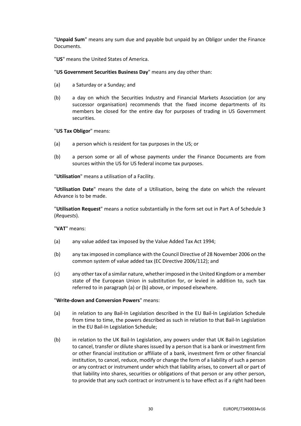 30 EUROPE/73490034v16 "Unpaid Sum" means any sum due and payable but unpaid by an Obligor under the Finance Documents. "US" means the United States of America. "US Government Securities Business Day" means any day other than: (a) a Saturday or a Sunday; and (b) a day on which the Securities Industry and Financial Markets Association (or any successor organisation) recommends that the fixed income departments of its members be closed for the entire day for purposes of trading in US Government securities. "US Tax Obligor" means: (a) a person which is resident for tax purposes in the US; or (b) a person some or all of whose payments under the Finance Documents are from sources within the US for US federal income tax purposes. "Utilisation" means a utilisation of a Facility. "Utilisation Date" means the date of a Utilisation, being the date on which the relevant Advance is to be made. "Utilisation Request" means a notice substantially in the form set out in Part A of Schedule 3 (Requests). "VAT" means: (a) any value added tax imposed by the Value Added Tax Act 1994; (b) any tax imposed in compliance with the Council Directive of 28 November 2006 on the common system of value added tax (EC Directive 2006/112); and (c) any other tax of a similar nature, whether imposed in the United Kingdom or a member state of the European Union in substitution for, or levied in addition to, such tax referred to in paragraph (a) or (b) above, or imposed elsewhere. "Write-down and Conversion Powers" means: (a) in relation to any Bail-In Legislation described in the EU Bail-In Legislation Schedule from time to time, the powers described as such in relation to that Bail-In Legislation in the EU Bail-In Legislation Schedule; (b) in relation to the UK Bail-In Legislation, any powers under that UK Bail-In Legislation to cancel, transfer or dilute shares issued by a person that is a bank or investment firm or other financial institution or affiliate of a bank, investment firm or other financial institution, to cancel, reduce, modify or change the form of a liability of such a person or any contract or instrument under which that liability arises, to convert all or part of that liability into shares, securities or obligations of that person or any other person, to provide that any such contract or instrument is to have effect as if a right had been