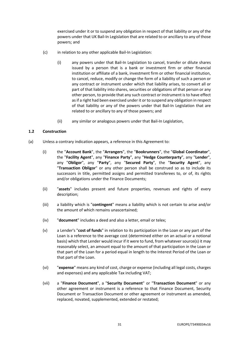 31 EUROPE/73490034v16 exercised under it or to suspend any obligation in respect of that liability or any of the powers under that UK Bail-In Legislation that are related to or ancillary to any of those powers; and (c) in relation to any other applicable Bail-In Legislation: (i) any powers under that Bail-In Legislation to cancel, transfer or dilute shares issued by a person that is a bank or investment firm or other financial institution or affiliate of a bank, investment firm or other financial institution, to cancel, reduce, modify or change the form of a liability of such a person or any contract or instrument under which that liability arises, to convert all or part of that liability into shares, securities or obligations of that person or any other person, to provide that any such contract or instrument is to have effect as if a right had been exercised under it or to suspend any obligation in respect of that liability or any of the powers under that Bail-In Legislation that are related to or ancillary to any of those powers; and (ii) any similar or analogous powers under that Bail-In Legislation, 1.2 Construction (a) Unless a contrary indication appears, a reference in this Agreement to: (i) the "Account Bank", the "Arrangers", the "Bookrunners", the "Global Coordinator", the "Facility Agent", any "Finance Party", any "Hedge Counterparty", any "Lender", any "Obligor", any "Party", any "Secured Party", the "Security Agent", any "Transaction Obligor" or any other person shall be construed so as to include its successors in title, permitted assigns and permitted transferees to, or of, its rights and/or obligations under the Finance Documents; (ii) "assets" includes present and future properties, revenues and rights of every description; (iii) a liability which is "contingent" means a liability which is not certain to arise and/or the amount of which remains unascertained; (iv) "document" includes a deed and also a letter, email or telex; (v) a Lender's "cost of funds" in relation to its participation in the Loan or any part of the Loan is a reference to the average cost (determined either on an actual or a notional basis) which that Lender would incur if it were to fund, from whatever source(s) it may reasonably select, an amount equal to the amount of that participation in the Loan or that part of the Loan for a period equal in length to the Interest Period of the Loan or that part of the Loan. (vi) "expense" means any kind of cost, charge or expense (including all legal costs, charges and expenses) and any applicable Tax including VAT; (vii) a "Finance Document", a "Security Document" or "Transaction Document" or any other agreement or instrument is a reference to that Finance Document, Security Document or Transaction Document or other agreement or instrument as amended, replaced, novated, supplemented, extended or restated;