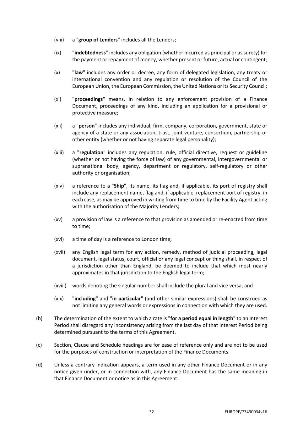 32 EUROPE/73490034v16 (viii) a "group of Lenders" includes all the Lenders; (ix) "indebtedness" includes any obligation (whether incurred as principal or as surety) for the payment or repayment of money, whether present or future, actual or contingent; (x) "law" includes any order or decree, any form of delegated legislation, any treaty or international convention and any regulation or resolution of the Council of the European Union, the European Commission, the United Nations or its Security Council; (xi) "proceedings" means, in relation to any enforcement provision of a Finance Document, proceedings of any kind, including an application for a provisional or protective measure; (xii) a "person" includes any individual, firm, company, corporation, government, state or agency of a state or any association, trust, joint venture, consortium, partnership or other entity (whether or not having separate legal personality); (xiii) a "regulation" includes any regulation, rule, official directive, request or guideline (whether or not having the force of law) of any governmental, intergovernmental or supranational body, agency, department or regulatory, self-regulatory or other authority or organisation; (xiv) a reference to a "Ship", its name, its flag and, if applicable, its port of registry shall include any replacement name, flag and, if applicable, replacement port of registry, in each case, as may be approved in writing from time to time by the Facility Agent acting with the authorisation of the Majority Lenders; (xv) a provision of law is a reference to that provision as amended or re-enacted from time to time; (xvi) a time of day is a reference to London time; (xvii) any English legal term for any action, remedy, method of judicial proceeding, legal document, legal status, court, official or any legal concept or thing shall, in respect of a jurisdiction other than England, be deemed to include that which most nearly approximates in that jurisdiction to the English legal term; (xviii) words denoting the singular number shall include the plural and vice versa; and (xix) "including" and "in particular" (and other similar expressions) shall be construed as not limiting any general words or expressions in connection with which they are used. (b) The determination of the extent to which a rate is "for a period equal in length" to an Interest Period shall disregard any inconsistency arising from the last day of that Interest Period being determined pursuant to the terms of this Agreement. (c) Section, Clause and Schedule headings are for ease of reference only and are not to be used for the purposes of construction or interpretation of the Finance Documents. (d) Unless a contrary indication appears, a term used in any other Finance Document or in any notice given under, or in connection with, any Finance Document has the same meaning in that Finance Document or notice as in this Agreement.