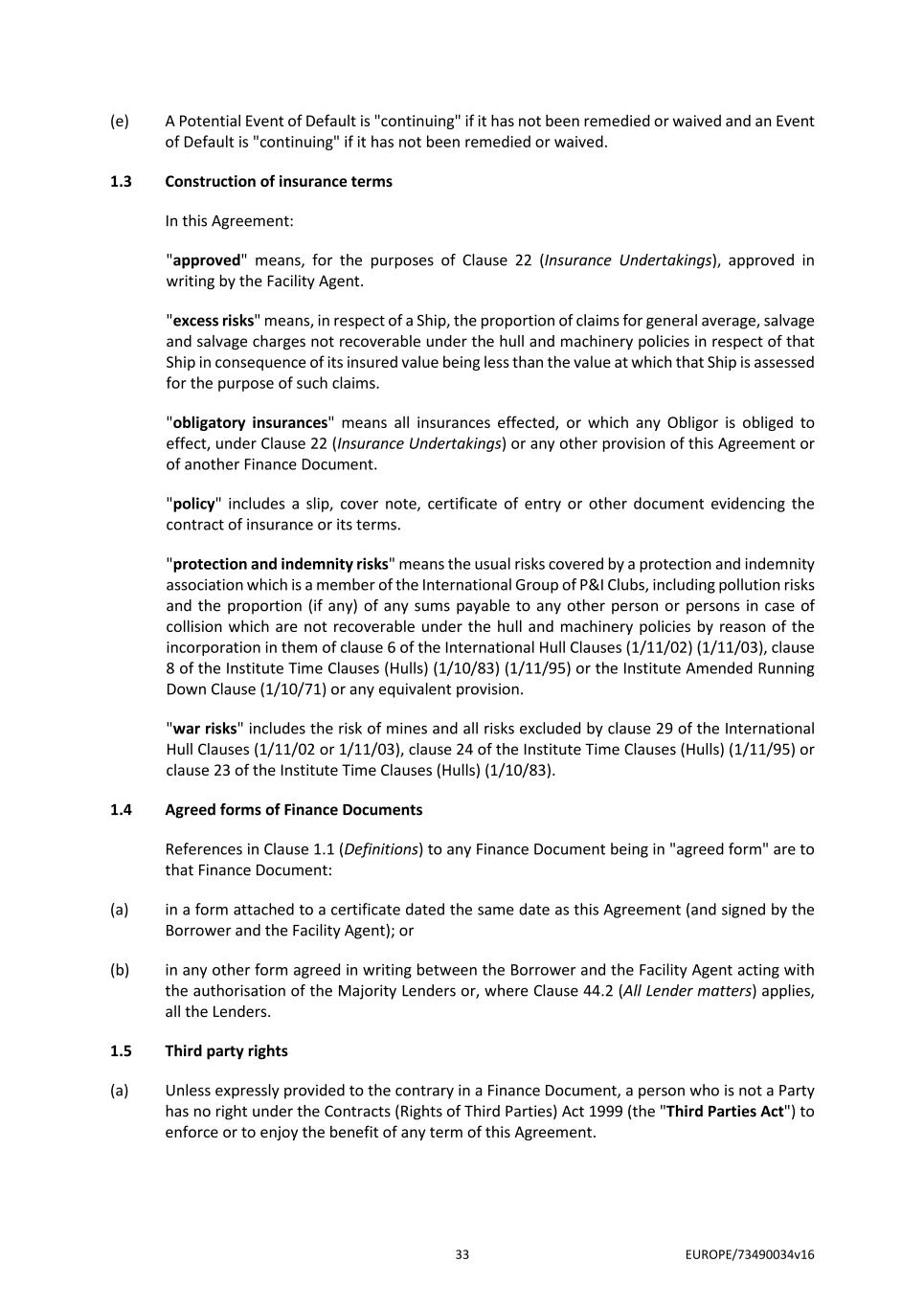 33 EUROPE/73490034v16 (e) A Potential Event of Default is "continuing" if it has not been remedied or waived and an Event of Default is "continuing" if it has not been remedied or waived. 1.3 Construction of insurance terms In this Agreement: "approved" means, for the purposes of Clause 22 (Insurance Undertakings), approved in writing by the Facility Agent. "excess risks" means, in respect of a Ship, the proportion of claims for general average, salvage and salvage charges not recoverable under the hull and machinery policies in respect of that Ship in consequence of its insured value being less than the value at which that Ship is assessed for the purpose of such claims. "obligatory insurances" means all insurances effected, or which any Obligor is obliged to effect, under Clause 22 (Insurance Undertakings) or any other provision of this Agreement or of another Finance Document. "policy" includes a slip, cover note, certificate of entry or other document evidencing the contract of insurance or its terms. "protection and indemnity risks" means the usual risks covered by a protection and indemnity association which is a member of the International Group of P&I Clubs, including pollution risks and the proportion (if any) of any sums payable to any other person or persons in case of collision which are not recoverable under the hull and machinery policies by reason of the incorporation in them of clause 6 of the International Hull Clauses (1/11/02) (1/11/03), clause 8 of the Institute Time Clauses (Hulls) (1/10/83) (1/11/95) or the Institute Amended Running Down Clause (1/10/71) or any equivalent provision. "war risks" includes the risk of mines and all risks excluded by clause 29 of the International Hull Clauses (1/11/02 or 1/11/03), clause 24 of the Institute Time Clauses (Hulls) (1/11/95) or clause 23 of the Institute Time Clauses (Hulls) (1/10/83). 1.4 Agreed forms of Finance Documents References in Clause 1.1 (Definitions) to any Finance Document being in "agreed form" are to that Finance Document: (a) in a form attached to a certificate dated the same date as this Agreement (and signed by the Borrower and the Facility Agent); or (b) in any other form agreed in writing between the Borrower and the Facility Agent acting with the authorisation of the Majority Lenders or, where Clause 44.2 (All Lender matters) applies, all the Lenders. 1.5 Third party rights (a) Unless expressly provided to the contrary in a Finance Document, a person who is not a Party has no right under the Contracts (Rights of Third Parties) Act 1999 (the "Third Parties Act") to enforce or to enjoy the benefit of any term of this Agreement.