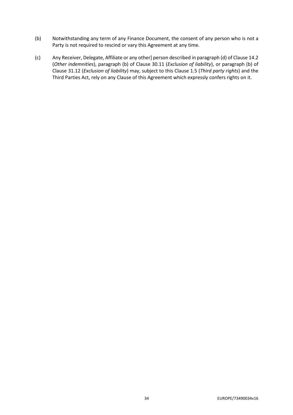 34 EUROPE/73490034v16 (b) Notwithstanding any term of any Finance Document, the consent of any person who is not a Party is not required to rescind or vary this Agreement at any time. (c) Any Receiver, Delegate, Affiliate or any other] person described in paragraph (d) of Clause 14.2 (Other indemnities), paragraph (b) of Clause 30.11 (Exclusion of liability), or paragraph (b) of Clause 31.12 (Exclusion of liability) may, subject to this Clause 1.5 (Third party rights) and the Third Parties Act, rely on any Clause of this Agreement which expressly confers rights on it.