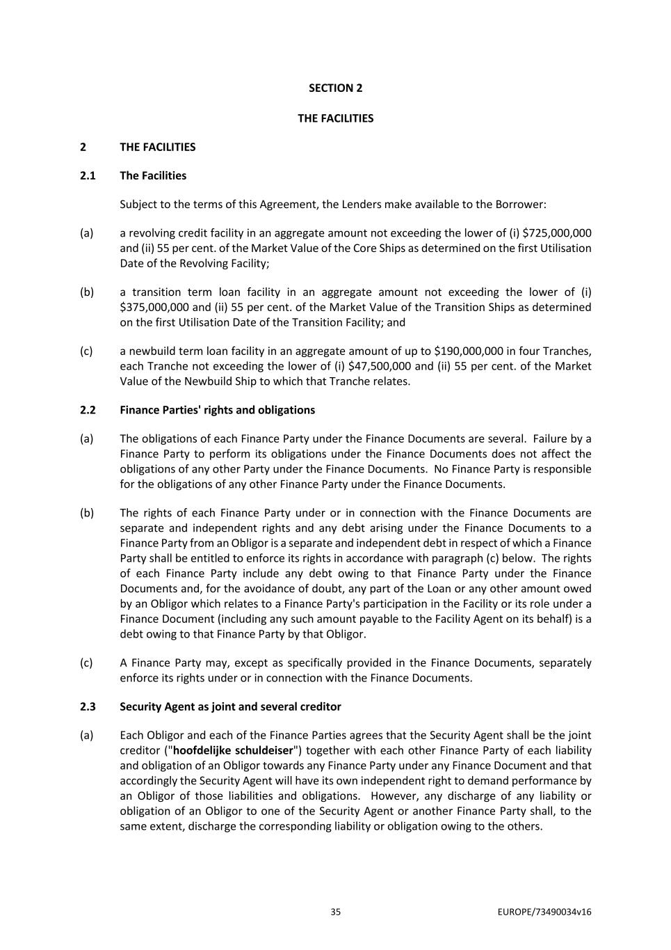 35 EUROPE/73490034v16 SECTION 2 THE FACILITIES 2 THE FACILITIES 2.1 The Facilities Subject to the terms of this Agreement, the Lenders make available to the Borrower: (a) a revolving credit facility in an aggregate amount not exceeding the lower of (i) $725,000,000 and (ii) 55 per cent. of the Market Value of the Core Ships as determined on the first Utilisation Date of the Revolving Facility; (b) a transition term loan facility in an aggregate amount not exceeding the lower of (i) $375,000,000 and (ii) 55 per cent. of the Market Value of the Transition Ships as determined on the first Utilisation Date of the Transition Facility; and (c) a newbuild term loan facility in an aggregate amount of up to $190,000,000 in four Tranches, each Tranche not exceeding the lower of (i) $47,500,000 and (ii) 55 per cent. of the Market Value of the Newbuild Ship to which that Tranche relates. 2.2 Finance Parties' rights and obligations (a) The obligations of each Finance Party under the Finance Documents are several. Failure by a Finance Party to perform its obligations under the Finance Documents does not affect the obligations of any other Party under the Finance Documents. No Finance Party is responsible for the obligations of any other Finance Party under the Finance Documents. (b) The rights of each Finance Party under or in connection with the Finance Documents are separate and independent rights and any debt arising under the Finance Documents to a Finance Party from an Obligor is a separate and independent debt in respect of which a Finance Party shall be entitled to enforce its rights in accordance with paragraph (c) below. The rights of each Finance Party include any debt owing to that Finance Party under the Finance Documents and, for the avoidance of doubt, any part of the Loan or any other amount owed by an Obligor which relates to a Finance Party's participation in the Facility or its role under a Finance Document (including any such amount payable to the Facility Agent on its behalf) is a debt owing to that Finance Party by that Obligor. (c) A Finance Party may, except as specifically provided in the Finance Documents, separately enforce its rights under or in connection with the Finance Documents. 2.3 Security Agent as joint and several creditor (a) Each Obligor and each of the Finance Parties agrees that the Security Agent shall be the joint creditor ("hoofdelijke schuldeiser") together with each other Finance Party of each liability and obligation of an Obligor towards any Finance Party under any Finance Document and that accordingly the Security Agent will have its own independent right to demand performance by an Obligor of those liabilities and obligations. However, any discharge of any liability or obligation of an Obligor to one of the Security Agent or another Finance Party shall, to the same extent, discharge the corresponding liability or obligation owing to the others.
