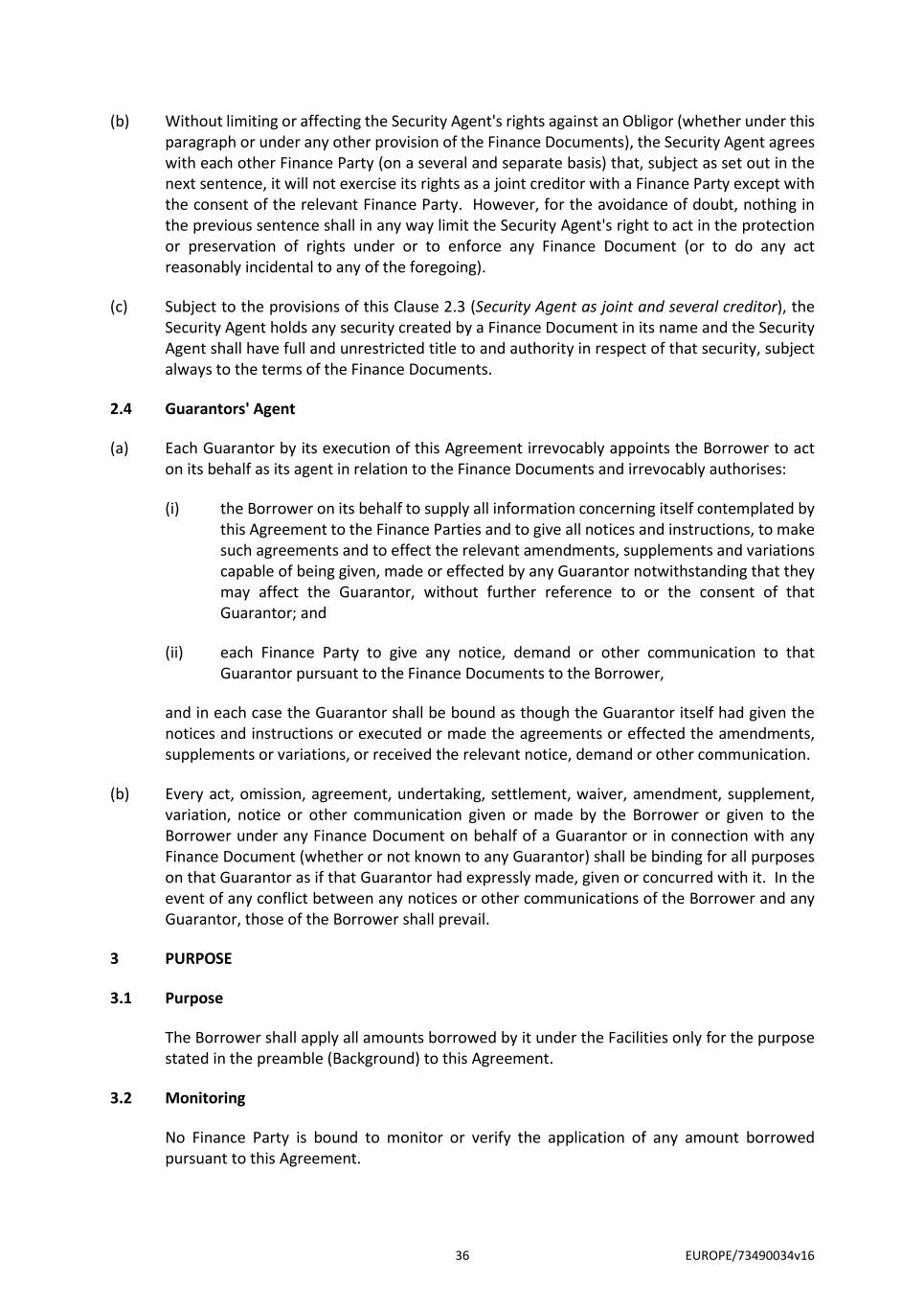 36 EUROPE/73490034v16 (b) Without limiting or affecting the Security Agent's rights against an Obligor (whether under this paragraph or under any other provision of the Finance Documents), the Security Agent agrees with each other Finance Party (on a several and separate basis) that, subject as set out in the next sentence, it will not exercise its rights as a joint creditor with a Finance Party except with the consent of the relevant Finance Party. However, for the avoidance of doubt, nothing in the previous sentence shall in any way limit the Security Agent's right to act in the protection or preservation of rights under or to enforce any Finance Document (or to do any act reasonably incidental to any of the foregoing). (c) Subject to the provisions of this Clause 2.3 (Security Agent as joint and several creditor), the Security Agent holds any security created by a Finance Document in its name and the Security Agent shall have full and unrestricted title to and authority in respect of that security, subject always to the terms of the Finance Documents. 2.4 Guarantors' Agent (a) Each Guarantor by its execution of this Agreement irrevocably appoints the Borrower to act on its behalf as its agent in relation to the Finance Documents and irrevocably authorises: (i) the Borrower on its behalf to supply all information concerning itself contemplated by this Agreement to the Finance Parties and to give all notices and instructions, to make such agreements and to effect the relevant amendments, supplements and variations capable of being given, made or effected by any Guarantor notwithstanding that they may affect the Guarantor, without further reference to or the consent of that Guarantor; and (ii) each Finance Party to give any notice, demand or other communication to that Guarantor pursuant to the Finance Documents to the Borrower, and in each case the Guarantor shall be bound as though the Guarantor itself had given the notices and instructions or executed or made the agreements or effected the amendments, supplements or variations, or received the relevant notice, demand or other communication. (b) Every act, omission, agreement, undertaking, settlement, waiver, amendment, supplement, variation, notice or other communication given or made by the Borrower or given to the Borrower under any Finance Document on behalf of a Guarantor or in connection with any Finance Document (whether or not known to any Guarantor) shall be binding for all purposes on that Guarantor as if that Guarantor had expressly made, given or concurred with it. In the event of any conflict between any notices or other communications of the Borrower and any Guarantor, those of the Borrower shall prevail. 3 PURPOSE 3.1 Purpose The Borrower shall apply all amounts borrowed by it under the Facilities only for the purpose stated in the preamble (Background) to this Agreement. 3.2 Monitoring No Finance Party is bound to monitor or verify the application of any amount borrowed pursuant to this Agreement.