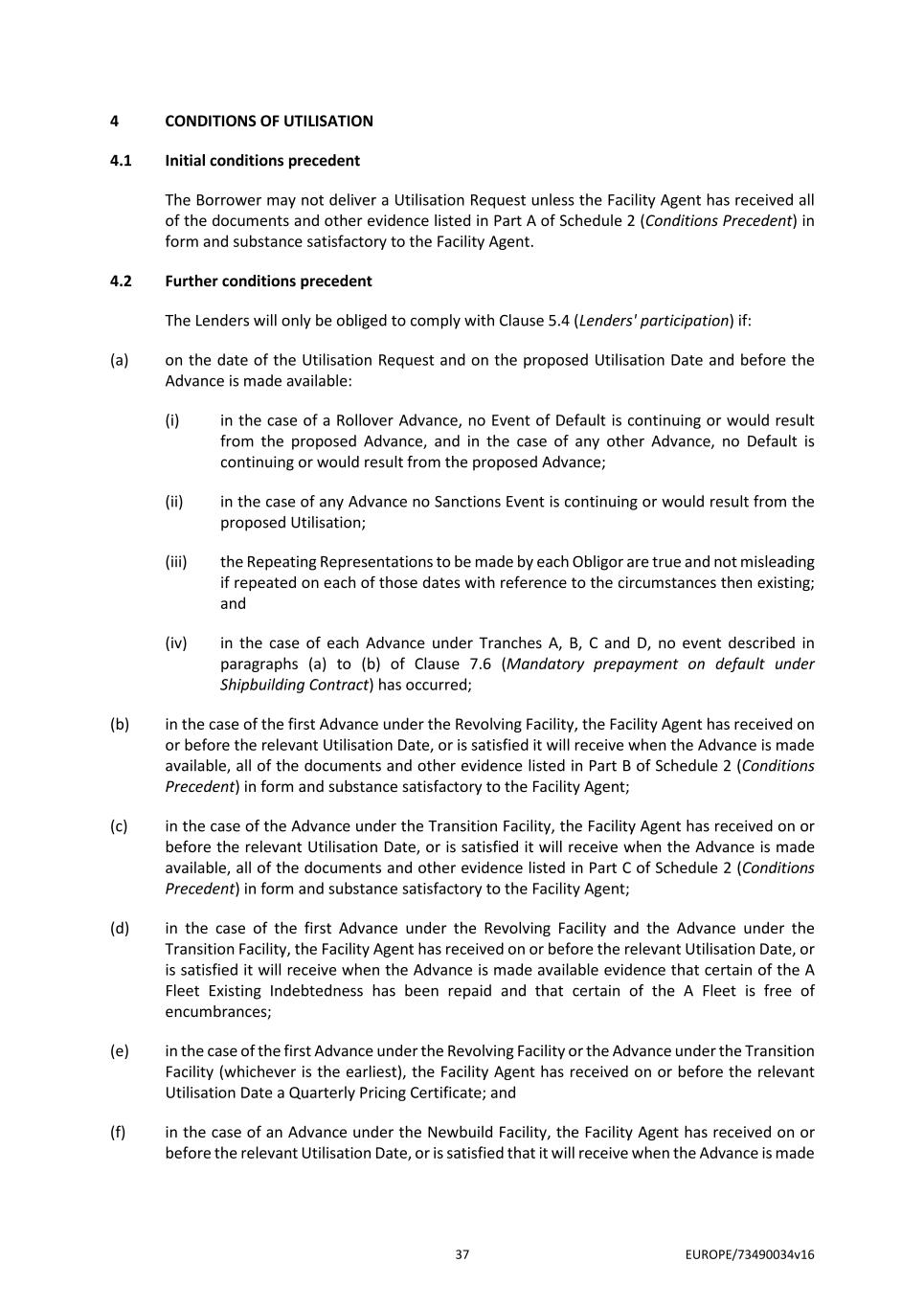 37 EUROPE/73490034v16 4 CONDITIONS OF UTILISATION 4.1 Initial conditions precedent The Borrower may not deliver a Utilisation Request unless the Facility Agent has received all of the documents and other evidence listed in Part A of Schedule 2 (Conditions Precedent) in form and substance satisfactory to the Facility Agent. 4.2 Further conditions precedent The Lenders will only be obliged to comply with Clause 5.4 (Lenders' participation) if: (a) on the date of the Utilisation Request and on the proposed Utilisation Date and before the Advance is made available: (i) in the case of a Rollover Advance, no Event of Default is continuing or would result from the proposed Advance, and in the case of any other Advance, no Default is continuing or would result from the proposed Advance; (ii) in the case of any Advance no Sanctions Event is continuing or would result from the proposed Utilisation; (iii) the Repeating Representations to be made by each Obligor are true and not misleading if repeated on each of those dates with reference to the circumstances then existing; and (iv) in the case of each Advance under Tranches A, B, C and D, no event described in paragraphs (a) to (b) of Clause 7.6 (Mandatory prepayment on default under Shipbuilding Contract) has occurred; (b) in the case of the first Advance under the Revolving Facility, the Facility Agent has received on or before the relevant Utilisation Date, or is satisfied it will receive when the Advance is made available, all of the documents and other evidence listed in Part B of Schedule 2 (Conditions Precedent) in form and substance satisfactory to the Facility Agent; (c) in the case of the Advance under the Transition Facility, the Facility Agent has received on or before the relevant Utilisation Date, or is satisfied it will receive when the Advance is made available, all of the documents and other evidence listed in Part C of Schedule 2 (Conditions Precedent) in form and substance satisfactory to the Facility Agent; (d) in the case of the first Advance under the Revolving Facility and the Advance under the Transition Facility, the Facility Agent has received on or before the relevant Utilisation Date, or is satisfied it will receive when the Advance is made available evidence that certain of the A Fleet Existing Indebtedness has been repaid and that certain of the A Fleet is free of encumbrances; (e) in the case of the first Advance under the Revolving Facility or the Advance under the Transition Facility (whichever is the earliest), the Facility Agent has received on or before the relevant Utilisation Date a Quarterly Pricing Certificate; and (f) in the case of an Advance under the Newbuild Facility, the Facility Agent has received on or before the relevant Utilisation Date, or is satisfied that it will receive when the Advance is made