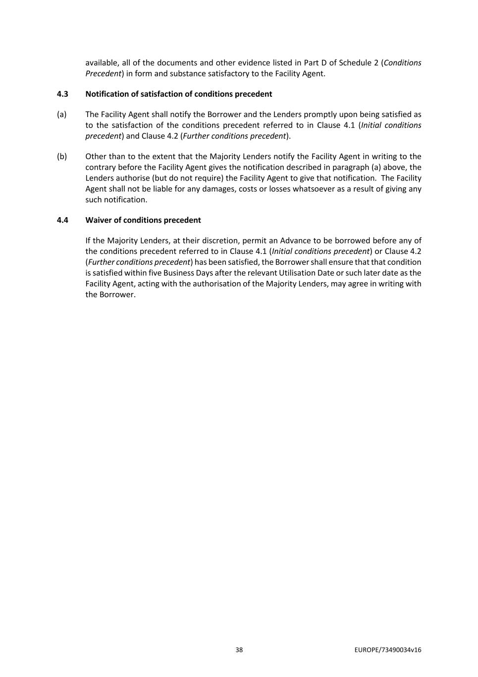 38 EUROPE/73490034v16 available, all of the documents and other evidence listed in Part D of Schedule 2 (Conditions Precedent) in form and substance satisfactory to the Facility Agent. 4.3 Notification of satisfaction of conditions precedent (a) The Facility Agent shall notify the Borrower and the Lenders promptly upon being satisfied as to the satisfaction of the conditions precedent referred to in Clause 4.1 (Initial conditions precedent) and Clause 4.2 (Further conditions precedent). (b) Other than to the extent that the Majority Lenders notify the Facility Agent in writing to the contrary before the Facility Agent gives the notification described in paragraph (a) above, the Lenders authorise (but do not require) the Facility Agent to give that notification. The Facility Agent shall not be liable for any damages, costs or losses whatsoever as a result of giving any such notification. 4.4 Waiver of conditions precedent If the Majority Lenders, at their discretion, permit an Advance to be borrowed before any of the conditions precedent referred to in Clause 4.1 (Initial conditions precedent) or Clause 4.2 (Further conditions precedent) has been satisfied, the Borrower shall ensure that that condition is satisfied within five Business Days after the relevant Utilisation Date or such later date as the Facility Agent, acting with the authorisation of the Majority Lenders, may agree in writing with the Borrower.