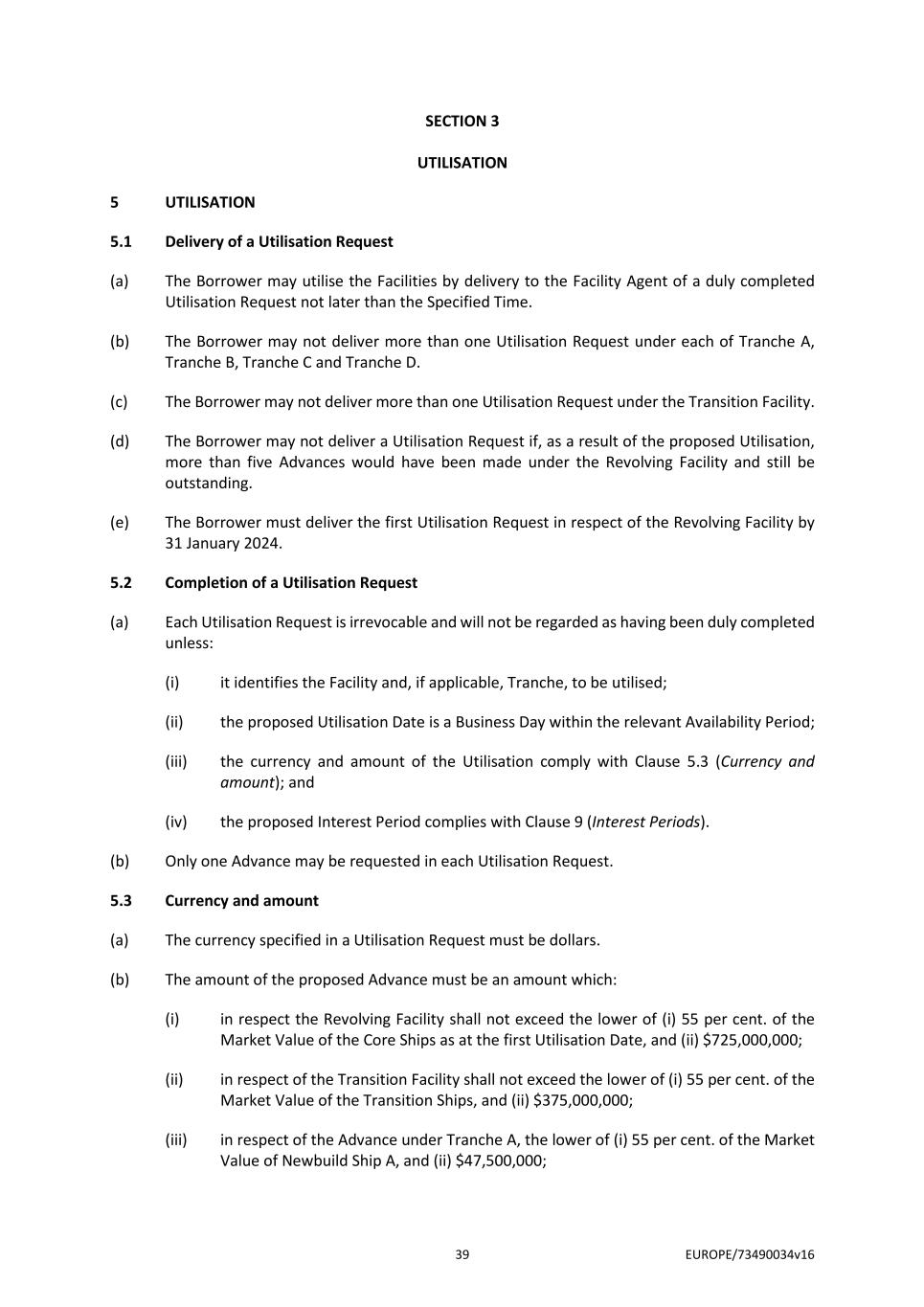 39 EUROPE/73490034v16 SECTION 3 UTILISATION 5 UTILISATION 5.1 Delivery of a Utilisation Request (a) The Borrower may utilise the Facilities by delivery to the Facility Agent of a duly completed Utilisation Request not later than the Specified Time. (b) The Borrower may not deliver more than one Utilisation Request under each of Tranche A, Tranche B, Tranche C and Tranche D. (c) The Borrower may not deliver more than one Utilisation Request under the Transition Facility. (d) The Borrower may not deliver a Utilisation Request if, as a result of the proposed Utilisation, more than five Advances would have been made under the Revolving Facility and still be outstanding. (e) The Borrower must deliver the first Utilisation Request in respect of the Revolving Facility by 31 January 2024. 5.2 Completion of a Utilisation Request (a) Each Utilisation Request is irrevocable and will not be regarded as having been duly completed unless: (i) it identifies the Facility and, if applicable, Tranche, to be utilised; (ii) the proposed Utilisation Date is a Business Day within the relevant Availability Period; (iii) the currency and amount of the Utilisation comply with Clause 5.3 (Currency and amount); and (iv) the proposed Interest Period complies with Clause 9 (Interest Periods). (b) Only one Advance may be requested in each Utilisation Request. 5.3 Currency and amount (a) The currency specified in a Utilisation Request must be dollars. (b) The amount of the proposed Advance must be an amount which: (i) in respect the Revolving Facility shall not exceed the lower of (i) 55 per cent. of the Market Value of the Core Ships as at the first Utilisation Date, and (ii) $725,000,000; (ii) in respect of the Transition Facility shall not exceed the lower of (i) 55 per cent. of the Market Value of the Transition Ships, and (ii) $375,000,000; (iii) in respect of the Advance under Tranche A, the lower of (i) 55 per cent. of the Market Value of Newbuild Ship A, and (ii) $47,500,000;