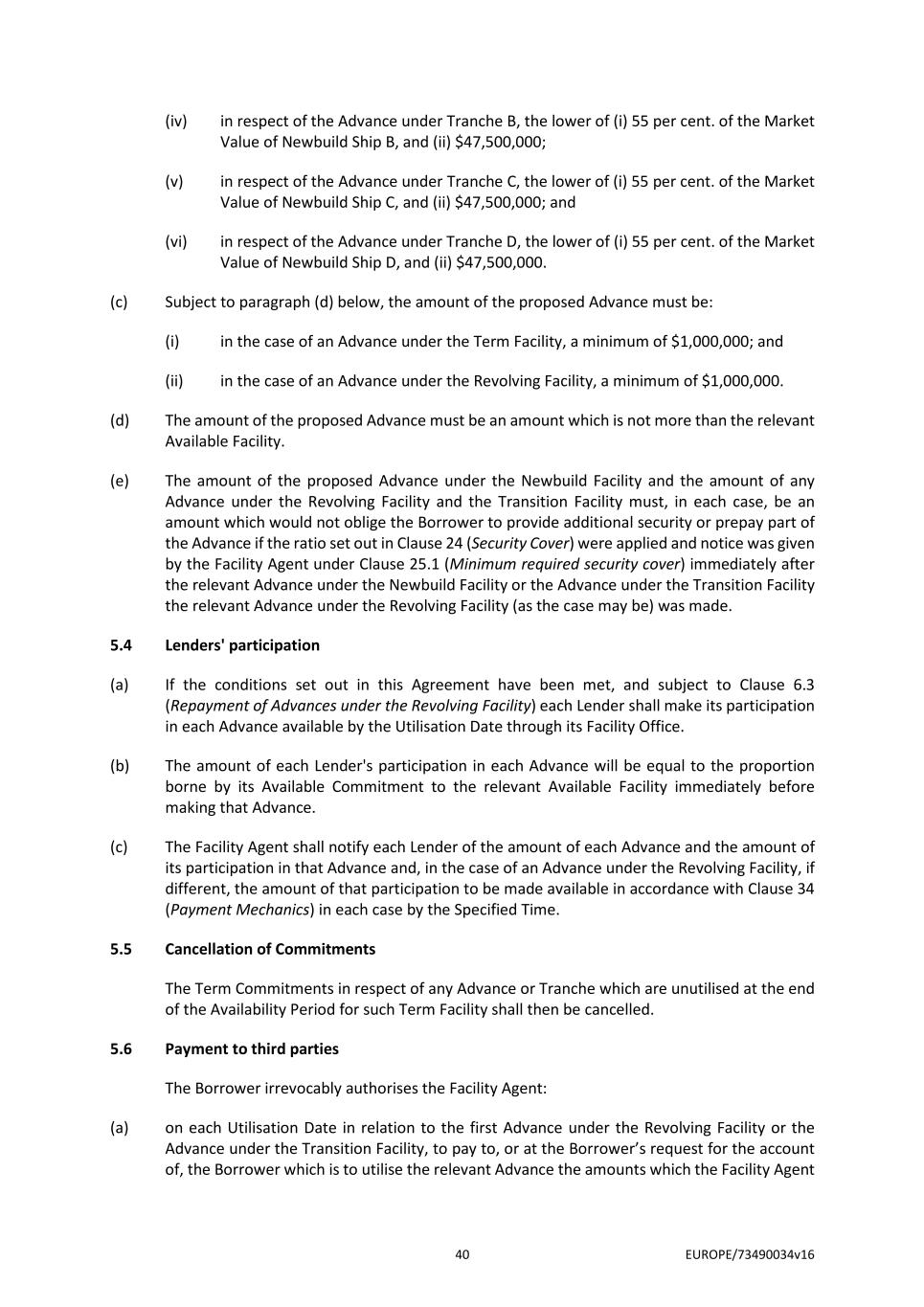 40 EUROPE/73490034v16 (iv) in respect of the Advance under Tranche B, the lower of (i) 55 per cent. of the Market Value of Newbuild Ship B, and (ii) $47,500,000; (v) in respect of the Advance under Tranche C, the lower of (i) 55 per cent. of the Market Value of Newbuild Ship C, and (ii) $47,500,000; and (vi) in respect of the Advance under Tranche D, the lower of (i) 55 per cent. of the Market Value of Newbuild Ship D, and (ii) $47,500,000. (c) Subject to paragraph (d) below, the amount of the proposed Advance must be: (i) in the case of an Advance under the Term Facility, a minimum of $1,000,000; and (ii) in the case of an Advance under the Revolving Facility, a minimum of $1,000,000. (d) The amount of the proposed Advance must be an amount which is not more than the relevant Available Facility. (e) The amount of the proposed Advance under the Newbuild Facility and the amount of any Advance under the Revolving Facility and the Transition Facility must, in each case, be an amount which would not oblige the Borrower to provide additional security or prepay part of the Advance if the ratio set out in Clause 24 (Security Cover) were applied and notice was given by the Facility Agent under Clause 25.1 (Minimum required security cover) immediately after the relevant Advance under the Newbuild Facility or the Advance under the Transition Facility the relevant Advance under the Revolving Facility (as the case may be) was made. 5.4 Lenders' participation (a) If the conditions set out in this Agreement have been met, and subject to Clause 6.3 (Repayment of Advances under the Revolving Facility) each Lender shall make its participation in each Advance available by the Utilisation Date through its Facility Office. (b) The amount of each Lender's participation in each Advance will be equal to the proportion borne by its Available Commitment to the relevant Available Facility immediately before making that Advance. (c) The Facility Agent shall notify each Lender of the amount of each Advance and the amount of its participation in that Advance and, in the case of an Advance under the Revolving Facility, if different, the amount of that participation to be made available in accordance with Clause 34 (Payment Mechanics) in each case by the Specified Time. 5.5 Cancellation of Commitments The Term Commitments in respect of any Advance or Tranche which are unutilised at the end of the Availability Period for such Term Facility shall then be cancelled. 5.6 Payment to third parties The Borrower irrevocably authorises the Facility Agent: (a) on each Utilisation Date in relation to the first Advance under the Revolving Facility or the Advance under the Transition Facility, to pay to, or at the Borrower’s request for the account of, the Borrower which is to utilise the relevant Advance the amounts which the Facility Agent