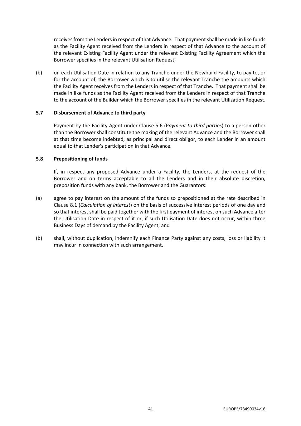41 EUROPE/73490034v16 receives from the Lenders in respect of that Advance. That payment shall be made in like funds as the Facility Agent received from the Lenders in respect of that Advance to the account of the relevant Existing Facility Agent under the relevant Existing Facility Agreement which the Borrower specifies in the relevant Utilisation Request; (b) on each Utilisation Date in relation to any Tranche under the Newbuild Facility, to pay to, or for the account of, the Borrower which is to utilise the relevant Tranche the amounts which the Facility Agent receives from the Lenders in respect of that Tranche. That payment shall be made in like funds as the Facility Agent received from the Lenders in respect of that Tranche to the account of the Builder which the Borrower specifies in the relevant Utilisation Request. 5.7 Disbursement of Advance to third party Payment by the Facility Agent under Clause 5.6 (Payment to third parties) to a person other than the Borrower shall constitute the making of the relevant Advance and the Borrower shall at that time become indebted, as principal and direct obligor, to each Lender in an amount equal to that Lender's participation in that Advance. 5.8 Prepositioning of funds If, in respect any proposed Advance under a Facility, the Lenders, at the request of the Borrower and on terms acceptable to all the Lenders and in their absolute discretion, preposition funds with any bank, the Borrower and the Guarantors: (a) agree to pay interest on the amount of the funds so prepositioned at the rate described in Clause 8.1 (Calculation of interest) on the basis of successive interest periods of one day and so that interest shall be paid together with the first payment of interest on such Advance after the Utilisation Date in respect of it or, if such Utilisation Date does not occur, within three Business Days of demand by the Facility Agent; and (b) shall, without duplication, indemnify each Finance Party against any costs, loss or liability it may incur in connection with such arrangement.