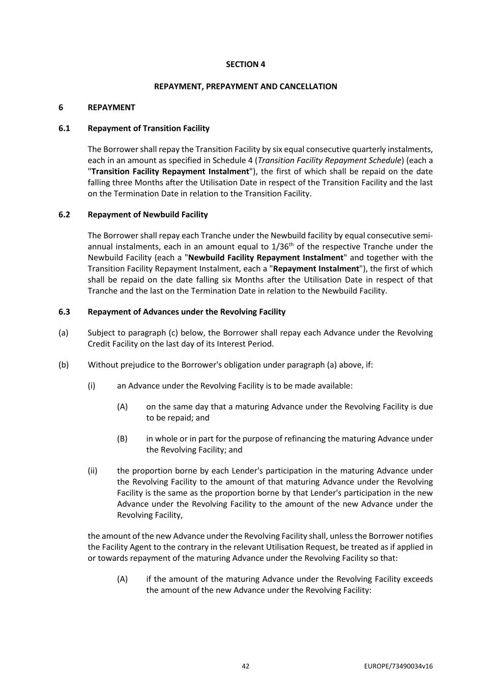 42 EUROPE/73490034v16 SECTION 4 REPAYMENT, PREPAYMENT AND CANCELLATION 6 REPAYMENT 6.1 Repayment of Transition Facility The Borrower shall repay the Transition Facility by six equal consecutive quarterly instalments, each in an amount as specified in Schedule 4 (Transition Facility Repayment Schedule) (each a "Transition Facility Repayment Instalment"), the first of which shall be repaid on the date falling three Months after the Utilisation Date in respect of the Transition Facility and the last on the Termination Date in relation to the Transition Facility. 6.2 Repayment of Newbuild Facility The Borrower shall repay each Tranche under the Newbuild facility by equal consecutive semi- annual instalments, each in an amount equal to 1/36th of the respective Tranche under the Newbuild Facility (each a "Newbuild Facility Repayment Instalment" and together with the Transition Facility Repayment Instalment, each a "Repayment Instalment"), the first of which shall be repaid on the date falling six Months after the Utilisation Date in respect of that Tranche and the last on the Termination Date in relation to the Newbuild Facility. 6.3 Repayment of Advances under the Revolving Facility (a) Subject to paragraph (c) below, the Borrower shall repay each Advance under the Revolving Credit Facility on the last day of its Interest Period. (b) Without prejudice to the Borrower's obligation under paragraph (a) above, if: (i) an Advance under the Revolving Facility is to be made available: (A) on the same day that a maturing Advance under the Revolving Facility is due to be repaid; and (B) in whole or in part for the purpose of refinancing the maturing Advance under the Revolving Facility; and (ii) the proportion borne by each Lender's participation in the maturing Advance under the Revolving Facility to the amount of that maturing Advance under the Revolving Facility is the same as the proportion borne by that Lender's participation in the new Advance under the Revolving Facility to the amount of the new Advance under the Revolving Facility, the amount of the new Advance under the Revolving Facility shall, unless the Borrower notifies the Facility Agent to the contrary in the relevant Utilisation Request, be treated as if applied in or towards repayment of the maturing Advance under the Revolving Facility so that: (A) if the amount of the maturing Advance under the Revolving Facility exceeds the amount of the new Advance under the Revolving Facility: