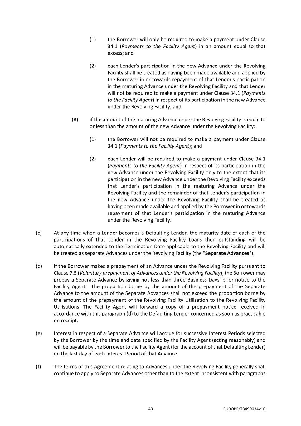 43 EUROPE/73490034v16 (1) the Borrower will only be required to make a payment under Clause 34.1 (Payments to the Facility Agent) in an amount equal to that excess; and (2) each Lender's participation in the new Advance under the Revolving Facility shall be treated as having been made available and applied by the Borrower in or towards repayment of that Lender's participation in the maturing Advance under the Revolving Facility and that Lender will not be required to make a payment under Clause 34.1 (Payments to the Facility Agent) in respect of its participation in the new Advance under the Revolving Facility; and (B) if the amount of the maturing Advance under the Revolving Facility is equal to or less than the amount of the new Advance under the Revolving Facility: (1) the Borrower will not be required to make a payment under Clause 34.1 (Payments to the Facility Agent); and (2) each Lender will be required to make a payment under Clause 34.1 (Payments to the Facility Agent) in respect of its participation in the new Advance under the Revolving Facility only to the extent that its participation in the new Advance under the Revolving Facility exceeds that Lender's participation in the maturing Advance under the Revolving Facility and the remainder of that Lender's participation in the new Advance under the Revolving Facility shall be treated as having been made available and applied by the Borrower in or towards repayment of that Lender's participation in the maturing Advance under the Revolving Facility. (c) At any time when a Lender becomes a Defaulting Lender, the maturity date of each of the participations of that Lender in the Revolving Facility Loans then outstanding will be automatically extended to the Termination Date applicable to the Revolving Facility and will be treated as separate Advances under the Revolving Facility (the "Separate Advances"). (d) If the Borrower makes a prepayment of an Advance under the Revolving Facility pursuant to Clause 7.5 (Voluntary prepayment of Advances under the Revolving Facility), the Borrower may prepay a Separate Advance by giving not less than three Business Days' prior notice to the Facility Agent. The proportion borne by the amount of the prepayment of the Separate Advance to the amount of the Separate Advances shall not exceed the proportion borne by the amount of the prepayment of the Revolving Facility Utilisation to the Revolving Facility Utilisations. The Facility Agent will forward a copy of a prepayment notice received in accordance with this paragraph (d) to the Defaulting Lender concerned as soon as practicable on receipt. (e) Interest in respect of a Separate Advance will accrue for successive Interest Periods selected by the Borrower by the time and date specified by the Facility Agent (acting reasonably) and will be payable by the Borrower to the Facility Agent (for the account of that Defaulting Lender) on the last day of each Interest Period of that Advance. (f) The terms of this Agreement relating to Advances under the Revolving Facility generally shall continue to apply to Separate Advances other than to the extent inconsistent with paragraphs