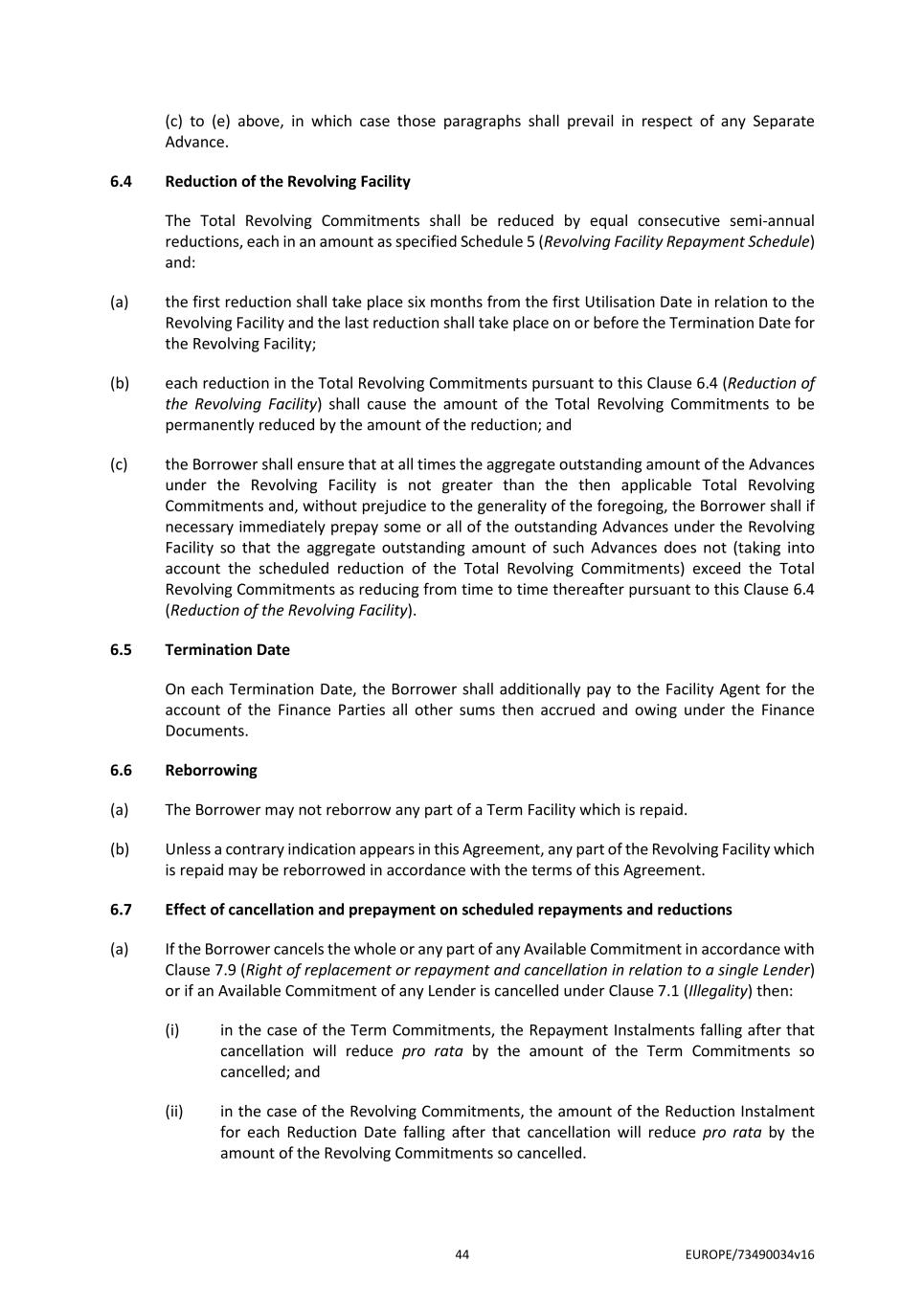 44 EUROPE/73490034v16 (c) to (e) above, in which case those paragraphs shall prevail in respect of any Separate Advance. 6.4 Reduction of the Revolving Facility The Total Revolving Commitments shall be reduced by equal consecutive semi-annual reductions, each in an amount as specified Schedule 5 (Revolving Facility Repayment Schedule) and: (a) the first reduction shall take place six months from the first Utilisation Date in relation to the Revolving Facility and the last reduction shall take place on or before the Termination Date for the Revolving Facility; (b) each reduction in the Total Revolving Commitments pursuant to this Clause 6.4 (Reduction of the Revolving Facility) shall cause the amount of the Total Revolving Commitments to be permanently reduced by the amount of the reduction; and (c) the Borrower shall ensure that at all times the aggregate outstanding amount of the Advances under the Revolving Facility is not greater than the then applicable Total Revolving Commitments and, without prejudice to the generality of the foregoing, the Borrower shall if necessary immediately prepay some or all of the outstanding Advances under the Revolving Facility so that the aggregate outstanding amount of such Advances does not (taking into account the scheduled reduction of the Total Revolving Commitments) exceed the Total Revolving Commitments as reducing from time to time thereafter pursuant to this Clause 6.4 (Reduction of the Revolving Facility). 6.5 Termination Date On each Termination Date, the Borrower shall additionally pay to the Facility Agent for the account of the Finance Parties all other sums then accrued and owing under the Finance Documents. 6.6 Reborrowing (a) The Borrower may not reborrow any part of a Term Facility which is repaid. (b) Unless a contrary indication appears in this Agreement, any part of the Revolving Facility which is repaid may be reborrowed in accordance with the terms of this Agreement. 6.7 Effect of cancellation and prepayment on scheduled repayments and reductions (a) If the Borrower cancels the whole or any part of any Available Commitment in accordance with Clause 7.9 (Right of replacement or repayment and cancellation in relation to a single Lender) or if an Available Commitment of any Lender is cancelled under Clause 7.1 (Illegality) then: (i) in the case of the Term Commitments, the Repayment Instalments falling after that cancellation will reduce pro rata by the amount of the Term Commitments so cancelled; and (ii) in the case of the Revolving Commitments, the amount of the Reduction Instalment for each Reduction Date falling after that cancellation will reduce pro rata by the amount of the Revolving Commitments so cancelled.