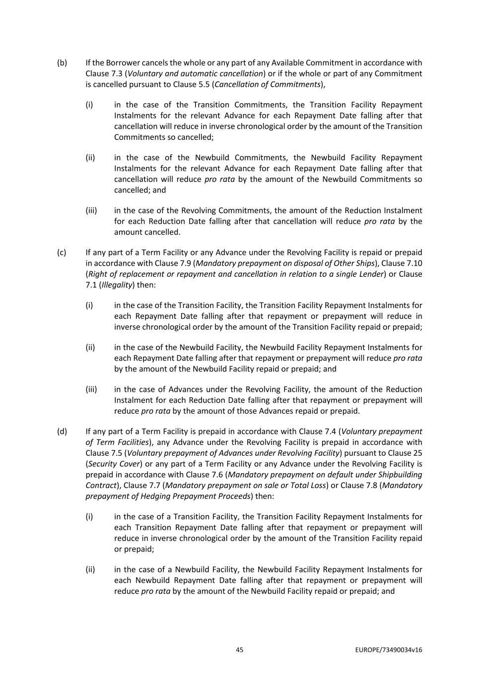 45 EUROPE/73490034v16 (b) If the Borrower cancels the whole or any part of any Available Commitment in accordance with Clause 7.3 (Voluntary and automatic cancellation) or if the whole or part of any Commitment is cancelled pursuant to Clause 5.5 (Cancellation of Commitments), (i) in the case of the Transition Commitments, the Transition Facility Repayment Instalments for the relevant Advance for each Repayment Date falling after that cancellation will reduce in inverse chronological order by the amount of the Transition Commitments so cancelled; (ii) in the case of the Newbuild Commitments, the Newbuild Facility Repayment Instalments for the relevant Advance for each Repayment Date falling after that cancellation will reduce pro rata by the amount of the Newbuild Commitments so cancelled; and (iii) in the case of the Revolving Commitments, the amount of the Reduction Instalment for each Reduction Date falling after that cancellation will reduce pro rata by the amount cancelled. (c) If any part of a Term Facility or any Advance under the Revolving Facility is repaid or prepaid in accordance with Clause 7.9 (Mandatory prepayment on disposal of Other Ships), Clause 7.10 (Right of replacement or repayment and cancellation in relation to a single Lender) or Clause 7.1 (Illegality) then: (i) in the case of the Transition Facility, the Transition Facility Repayment Instalments for each Repayment Date falling after that repayment or prepayment will reduce in inverse chronological order by the amount of the Transition Facility repaid or prepaid; (ii) in the case of the Newbuild Facility, the Newbuild Facility Repayment Instalments for each Repayment Date falling after that repayment or prepayment will reduce pro rata by the amount of the Newbuild Facility repaid or prepaid; and (iii) in the case of Advances under the Revolving Facility, the amount of the Reduction Instalment for each Reduction Date falling after that repayment or prepayment will reduce pro rata by the amount of those Advances repaid or prepaid. (d) If any part of a Term Facility is prepaid in accordance with Clause 7.4 (Voluntary prepayment of Term Facilities), any Advance under the Revolving Facility is prepaid in accordance with Clause 7.5 (Voluntary prepayment of Advances under Revolving Facility) pursuant to Clause 25 (Security Cover) or any part of a Term Facility or any Advance under the Revolving Facility is prepaid in accordance with Clause 7.6 (Mandatory prepayment on default under Shipbuilding Contract), Clause 7.7 (Mandatory prepayment on sale or Total Loss) or Clause 7.8 (Mandatory prepayment of Hedging Prepayment Proceeds) then: (i) in the case of a Transition Facility, the Transition Facility Repayment Instalments for each Transition Repayment Date falling after that repayment or prepayment will reduce in inverse chronological order by the amount of the Transition Facility repaid or prepaid; (ii) in the case of a Newbuild Facility, the Newbuild Facility Repayment Instalments for each Newbuild Repayment Date falling after that repayment or prepayment will reduce pro rata by the amount of the Newbuild Facility repaid or prepaid; and