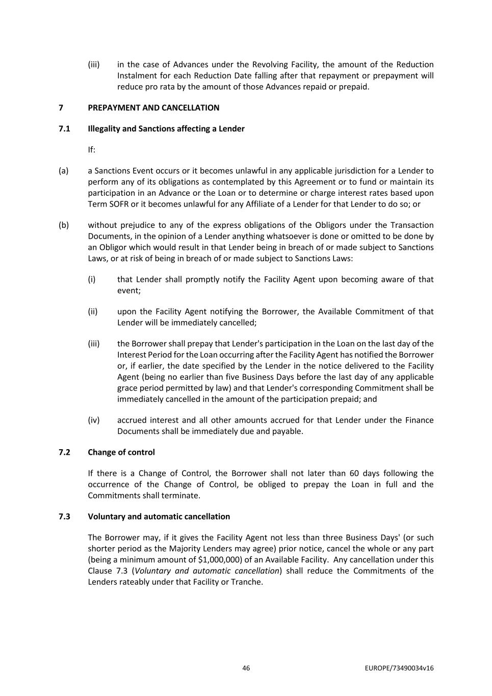 46 EUROPE/73490034v16 (iii) in the case of Advances under the Revolving Facility, the amount of the Reduction Instalment for each Reduction Date falling after that repayment or prepayment will reduce pro rata by the amount of those Advances repaid or prepaid. 7 PREPAYMENT AND CANCELLATION 7.1 Illegality and Sanctions affecting a Lender If: (a) a Sanctions Event occurs or it becomes unlawful in any applicable jurisdiction for a Lender to perform any of its obligations as contemplated by this Agreement or to fund or maintain its participation in an Advance or the Loan or to determine or charge interest rates based upon Term SOFR or it becomes unlawful for any Affiliate of a Lender for that Lender to do so; or (b) without prejudice to any of the express obligations of the Obligors under the Transaction Documents, in the opinion of a Lender anything whatsoever is done or omitted to be done by an Obligor which would result in that Lender being in breach of or made subject to Sanctions Laws, or at risk of being in breach of or made subject to Sanctions Laws: (i) that Lender shall promptly notify the Facility Agent upon becoming aware of that event; (ii) upon the Facility Agent notifying the Borrower, the Available Commitment of that Lender will be immediately cancelled; (iii) the Borrower shall prepay that Lender's participation in the Loan on the last day of the Interest Period for the Loan occurring after the Facility Agent has notified the Borrower or, if earlier, the date specified by the Lender in the notice delivered to the Facility Agent (being no earlier than five Business Days before the last day of any applicable grace period permitted by law) and that Lender's corresponding Commitment shall be immediately cancelled in the amount of the participation prepaid; and (iv) accrued interest and all other amounts accrued for that Lender under the Finance Documents shall be immediately due and payable. 7.2 Change of control If there is a Change of Control, the Borrower shall not later than 60 days following the occurrence of the Change of Control, be obliged to prepay the Loan in full and the Commitments shall terminate. 7.3 Voluntary and automatic cancellation The Borrower may, if it gives the Facility Agent not less than three Business Days' (or such shorter period as the Majority Lenders may agree) prior notice, cancel the whole or any part (being a minimum amount of $1,000,000) of an Available Facility. Any cancellation under this Clause 7.3 (Voluntary and automatic cancellation) shall reduce the Commitments of the Lenders rateably under that Facility or Tranche.