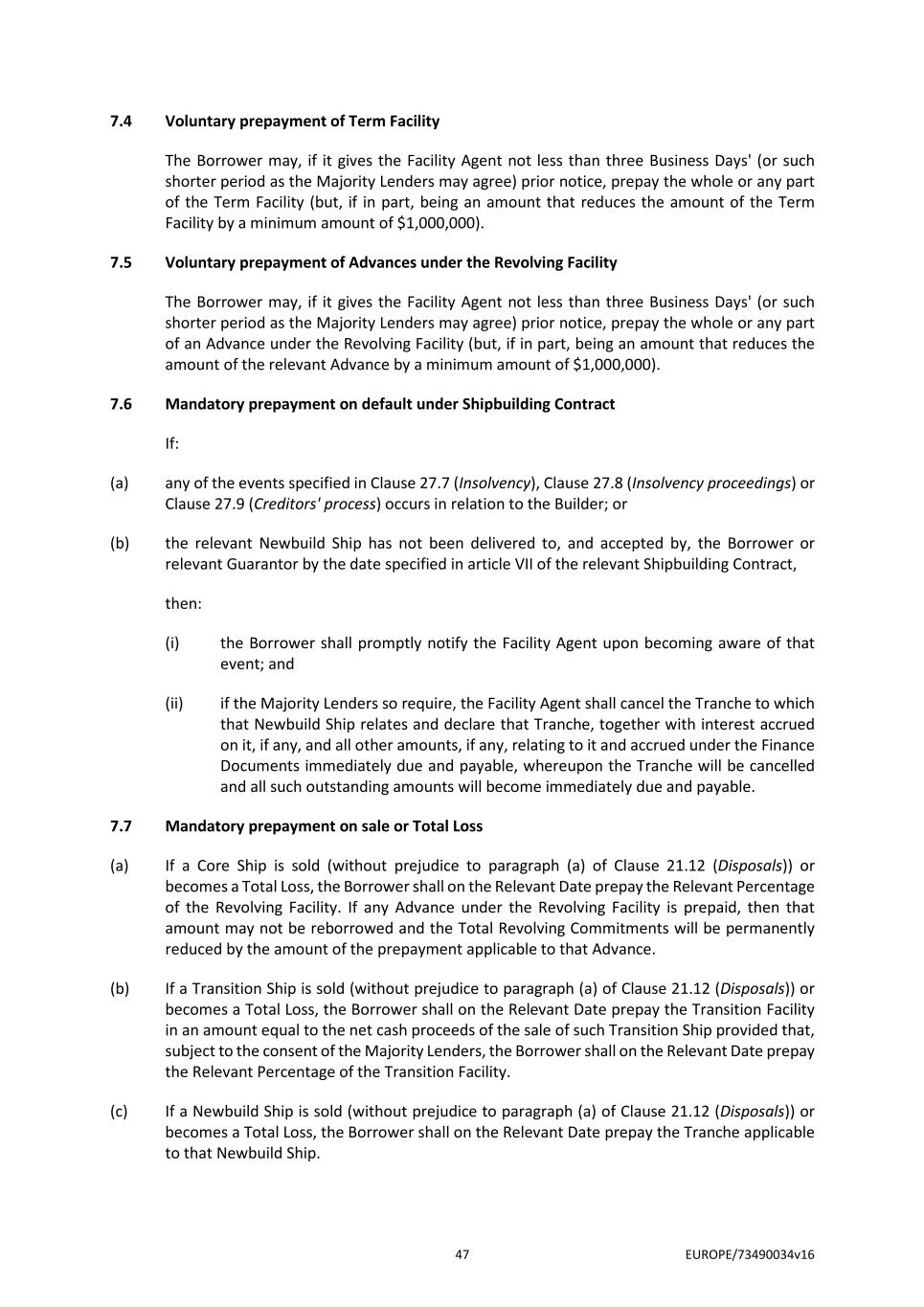 47 EUROPE/73490034v16 7.4 Voluntary prepayment of Term Facility The Borrower may, if it gives the Facility Agent not less than three Business Days' (or such shorter period as the Majority Lenders may agree) prior notice, prepay the whole or any part of the Term Facility (but, if in part, being an amount that reduces the amount of the Term Facility by a minimum amount of $1,000,000). 7.5 Voluntary prepayment of Advances under the Revolving Facility The Borrower may, if it gives the Facility Agent not less than three Business Days' (or such shorter period as the Majority Lenders may agree) prior notice, prepay the whole or any part of an Advance under the Revolving Facility (but, if in part, being an amount that reduces the amount of the relevant Advance by a minimum amount of $1,000,000). 7.6 Mandatory prepayment on default under Shipbuilding Contract If: (a) any of the events specified in Clause 27.7 (Insolvency), Clause 27.8 (Insolvency proceedings) or Clause 27.9 (Creditors' process) occurs in relation to the Builder; or (b) the relevant Newbuild Ship has not been delivered to, and accepted by, the Borrower or relevant Guarantor by the date specified in article VII of the relevant Shipbuilding Contract, then: (i) the Borrower shall promptly notify the Facility Agent upon becoming aware of that event; and (ii) if the Majority Lenders so require, the Facility Agent shall cancel the Tranche to which that Newbuild Ship relates and declare that Tranche, together with interest accrued on it, if any, and all other amounts, if any, relating to it and accrued under the Finance Documents immediately due and payable, whereupon the Tranche will be cancelled and all such outstanding amounts will become immediately due and payable. 7.7 Mandatory prepayment on sale or Total Loss (a) If a Core Ship is sold (without prejudice to paragraph (a) of Clause 21.12 (Disposals)) or becomes a Total Loss, the Borrower shall on the Relevant Date prepay the Relevant Percentage of the Revolving Facility. If any Advance under the Revolving Facility is prepaid, then that amount may not be reborrowed and the Total Revolving Commitments will be permanently reduced by the amount of the prepayment applicable to that Advance. (b) If a Transition Ship is sold (without prejudice to paragraph (a) of Clause 21.12 (Disposals)) or becomes a Total Loss, the Borrower shall on the Relevant Date prepay the Transition Facility in an amount equal to the net cash proceeds of the sale of such Transition Ship provided that, subject to the consent of the Majority Lenders, the Borrower shall on the Relevant Date prepay the Relevant Percentage of the Transition Facility. (c) If a Newbuild Ship is sold (without prejudice to paragraph (a) of Clause 21.12 (Disposals)) or becomes a Total Loss, the Borrower shall on the Relevant Date prepay the Tranche applicable to that Newbuild Ship.
