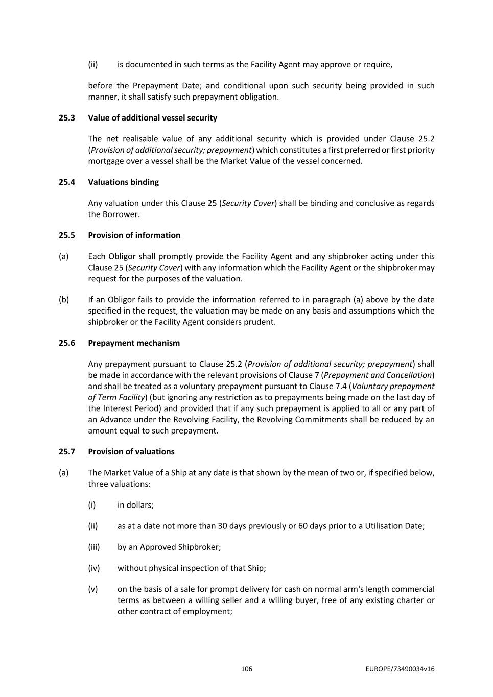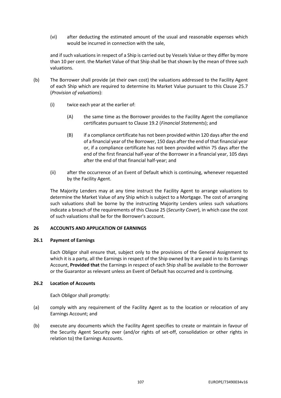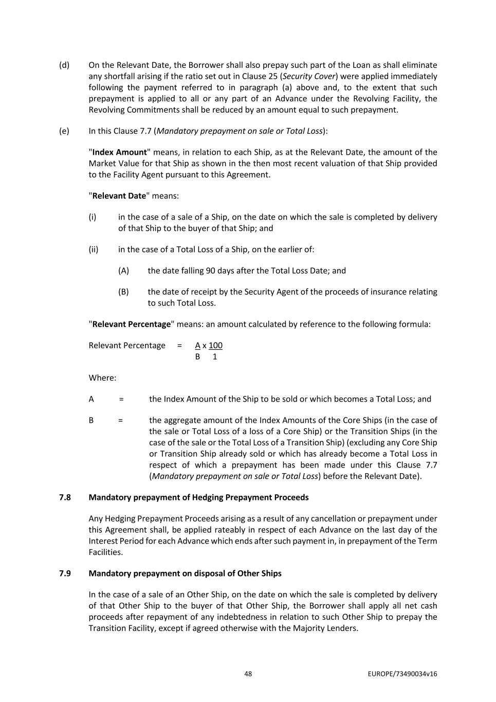 48 EUROPE/73490034v16 (d) On the Relevant Date, the Borrower shall also prepay such part of the Loan as shall eliminate any shortfall arising if the ratio set out in Clause 25 (Security Cover) were applied immediately following the payment referred to in paragraph (a) above and, to the extent that such prepayment is applied to all or any part of an Advance under the Revolving Facility, the Revolving Commitments shall be reduced by an amount equal to such prepayment. (e) In this Clause 7.7 (Mandatory prepayment on sale or Total Loss): "Index Amount" means, in relation to each Ship, as at the Relevant Date, the amount of the Market Value for that Ship as shown in the then most recent valuation of that Ship provided to the Facility Agent pursuant to this Agreement. "Relevant Date" means: (i) in the case of a sale of a Ship, on the date on which the sale is completed by delivery of that Ship to the buyer of that Ship; and (ii) in the case of a Total Loss of a Ship, on the earlier of: (A) the date falling 90 days after the Total Loss Date; and (B) the date of receipt by the Security Agent of the proceeds of insurance relating to such Total Loss. "Relevant Percentage" means: an amount calculated by reference to the following formula: Relevant Percentage = A x 100 B 1 Where: A = the Index Amount of the Ship to be sold or which becomes a Total Loss; and B = the aggregate amount of the Index Amounts of the Core Ships (in the case of the sale or Total Loss of a loss of a Core Ship) or the Transition Ships (in the case of the sale or the Total Loss of a Transition Ship) (excluding any Core Ship or Transition Ship already sold or which has already become a Total Loss in respect of which a prepayment has been made under this Clause 7.7 (Mandatory prepayment on sale or Total Loss) before the Relevant Date). 7.8 Mandatory prepayment of Hedging Prepayment Proceeds Any Hedging Prepayment Proceeds arising as a result of any cancellation or prepayment under this Agreement shall, be applied rateably in respect of each Advance on the last day of the Interest Period for each Advance which ends after such payment in, in prepayment of the Term Facilities. 7.9 Mandatory prepayment on disposal of Other Ships In the case of a sale of an Other Ship, on the date on which the sale is completed by delivery of that Other Ship to the buyer of that Other Ship, the Borrower shall apply all net cash proceeds after repayment of any indebtedness in relation to such Other Ship to prepay the Transition Facility, except if agreed otherwise with the Majority Lenders.