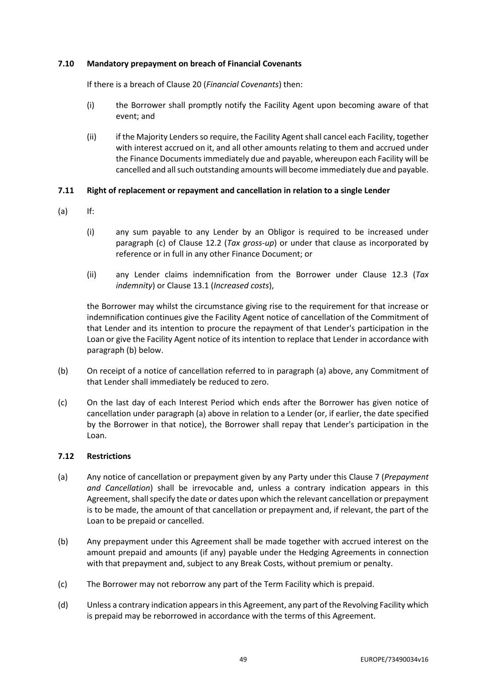 49 EUROPE/73490034v16 7.10 Mandatory prepayment on breach of Financial Covenants If there is a breach of Clause 20 (Financial Covenants) then: (i) the Borrower shall promptly notify the Facility Agent upon becoming aware of that event; and (ii) if the Majority Lenders so require, the Facility Agent shall cancel each Facility, together with interest accrued on it, and all other amounts relating to them and accrued under the Finance Documents immediately due and payable, whereupon each Facility will be cancelled and all such outstanding amounts will become immediately due and payable. 7.11 Right of replacement or repayment and cancellation in relation to a single Lender (a) If: (i) any sum payable to any Lender by an Obligor is required to be increased under paragraph (c) of Clause 12.2 (Tax gross-up) or under that clause as incorporated by reference or in full in any other Finance Document; or (ii) any Lender claims indemnification from the Borrower under Clause 12.3 (Tax indemnity) or Clause 13.1 (Increased costs), the Borrower may whilst the circumstance giving rise to the requirement for that increase or indemnification continues give the Facility Agent notice of cancellation of the Commitment of that Lender and its intention to procure the repayment of that Lender's participation in the Loan or give the Facility Agent notice of its intention to replace that Lender in accordance with paragraph (b) below. (b) On receipt of a notice of cancellation referred to in paragraph (a) above, any Commitment of that Lender shall immediately be reduced to zero. (c) On the last day of each Interest Period which ends after the Borrower has given notice of cancellation under paragraph (a) above in relation to a Lender (or, if earlier, the date specified by the Borrower in that notice), the Borrower shall repay that Lender's participation in the Loan. 7.12 Restrictions (a) Any notice of cancellation or prepayment given by any Party under this Clause 7 (Prepayment and Cancellation) shall be irrevocable and, unless a contrary indication appears in this Agreement, shall specify the date or dates upon which the relevant cancellation or prepayment is to be made, the amount of that cancellation or prepayment and, if relevant, the part of the Loan to be prepaid or cancelled. (b) Any prepayment under this Agreement shall be made together with accrued interest on the amount prepaid and amounts (if any) payable under the Hedging Agreements in connection with that prepayment and, subject to any Break Costs, without premium or penalty. (c) The Borrower may not reborrow any part of the Term Facility which is prepaid. (d) Unless a contrary indication appears in this Agreement, any part of the Revolving Facility which is prepaid may be reborrowed in accordance with the terms of this Agreement.