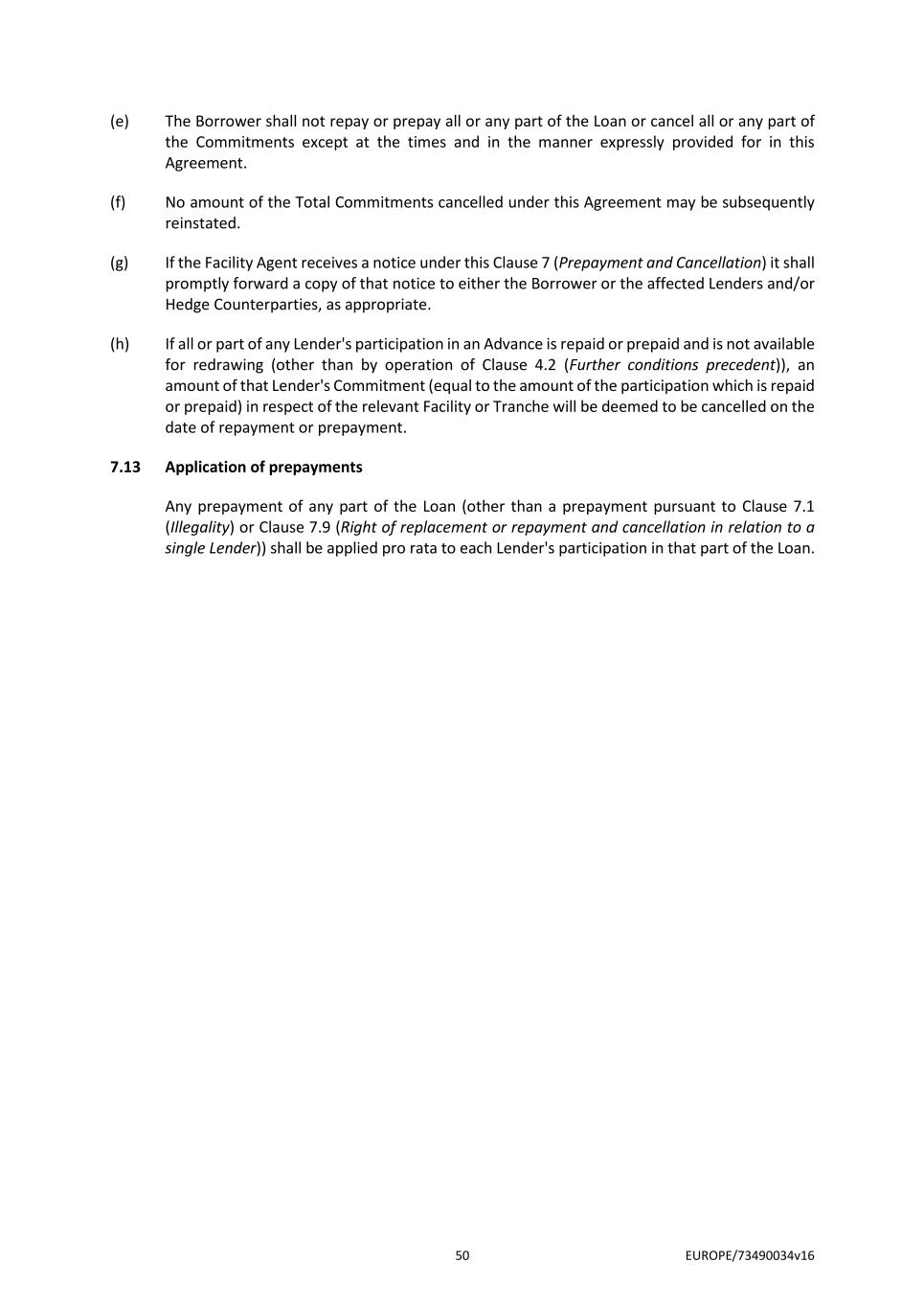 50 EUROPE/73490034v16 (e) The Borrower shall not repay or prepay all or any part of the Loan or cancel all or any part of the Commitments except at the times and in the manner expressly provided for in this Agreement. (f) No amount of the Total Commitments cancelled under this Agreement may be subsequently reinstated. (g) If the Facility Agent receives a notice under this Clause 7 (Prepayment and Cancellation) it shall promptly forward a copy of that notice to either the Borrower or the affected Lenders and/or Hedge Counterparties, as appropriate. (h) If all or part of any Lender's participation in an Advance is repaid or prepaid and is not available for redrawing (other than by operation of Clause 4.2 (Further conditions precedent)), an amount of that Lender's Commitment (equal to the amount of the participation which is repaid or prepaid) in respect of the relevant Facility or Tranche will be deemed to be cancelled on the date of repayment or prepayment. 7.13 Application of prepayments Any prepayment of any part of the Loan (other than a prepayment pursuant to Clause 7.1 (Illegality) or Clause 7.9 (Right of replacement or repayment and cancellation in relation to a single Lender)) shall be applied pro rata to each Lender's participation in that part of the Loan.