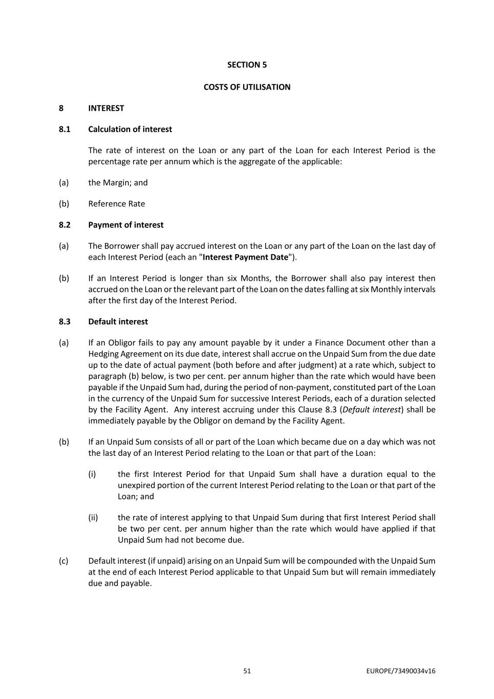 51 EUROPE/73490034v16 SECTION 5 COSTS OF UTILISATION 8 INTEREST 8.1 Calculation of interest The rate of interest on the Loan or any part of the Loan for each Interest Period is the percentage rate per annum which is the aggregate of the applicable: (a) the Margin; and (b) Reference Rate 8.2 Payment of interest (a) The Borrower shall pay accrued interest on the Loan or any part of the Loan on the last day of each Interest Period (each an "Interest Payment Date"). (b) If an Interest Period is longer than six Months, the Borrower shall also pay interest then accrued on the Loan or the relevant part of the Loan on the dates falling at six Monthly intervals after the first day of the Interest Period. 8.3 Default interest (a) If an Obligor fails to pay any amount payable by it under a Finance Document other than a Hedging Agreement on its due date, interest shall accrue on the Unpaid Sum from the due date up to the date of actual payment (both before and after judgment) at a rate which, subject to paragraph (b) below, is two per cent. per annum higher than the rate which would have been payable if the Unpaid Sum had, during the period of non-payment, constituted part of the Loan in the currency of the Unpaid Sum for successive Interest Periods, each of a duration selected by the Facility Agent. Any interest accruing under this Clause 8.3 (Default interest) shall be immediately payable by the Obligor on demand by the Facility Agent. (b) If an Unpaid Sum consists of all or part of the Loan which became due on a day which was not the last day of an Interest Period relating to the Loan or that part of the Loan: (i) the first Interest Period for that Unpaid Sum shall have a duration equal to the unexpired portion of the current Interest Period relating to the Loan or that part of the Loan; and (ii) the rate of interest applying to that Unpaid Sum during that first Interest Period shall be two per cent. per annum higher than the rate which would have applied if that Unpaid Sum had not become due. (c) Default interest (if unpaid) arising on an Unpaid Sum will be compounded with the Unpaid Sum at the end of each Interest Period applicable to that Unpaid Sum but will remain immediately due and payable.