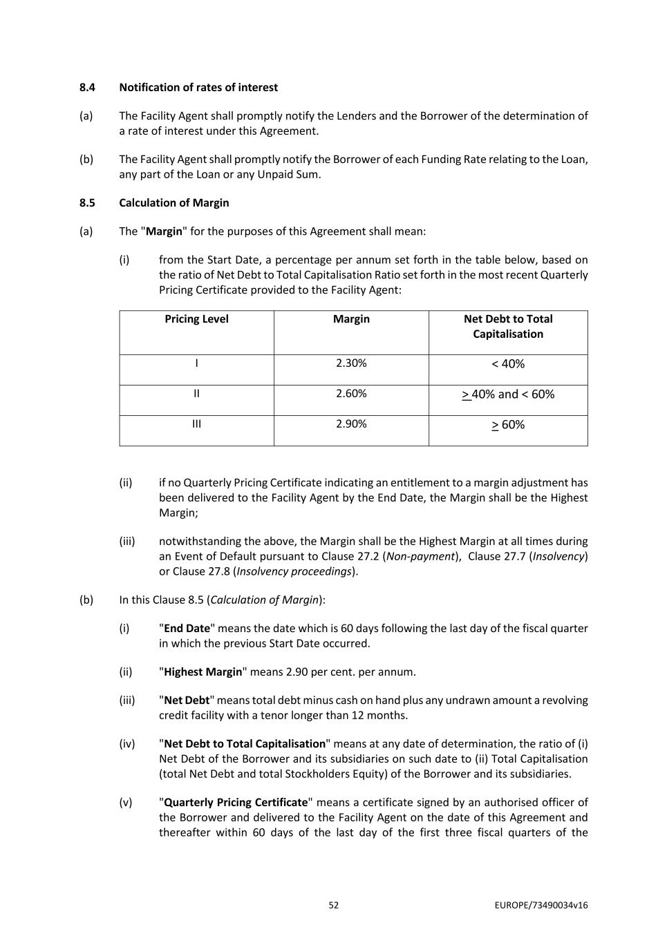 52 EUROPE/73490034v16 8.4 Notification of rates of interest (a) The Facility Agent shall promptly notify the Lenders and the Borrower of the determination of a rate of interest under this Agreement. (b) The Facility Agent shall promptly notify the Borrower of each Funding Rate relating to the Loan, any part of the Loan or any Unpaid Sum. 8.5 Calculation of Margin (a) The "Margin" for the purposes of this Agreement shall mean: (i) from the Start Date, a percentage per annum set forth in the table below, based on the ratio of Net Debt to Total Capitalisation Ratio set forth in the most recent Quarterly Pricing Certificate provided to the Facility Agent: Pricing Level Margin Net Debt to Total Capitalisation I 2.30% < 40% II 2.60% > 40% and < 60% III 2.90% > 60% (ii) if no Quarterly Pricing Certificate indicating an entitlement to a margin adjustment has been delivered to the Facility Agent by the End Date, the Margin shall be the Highest Margin; (iii) notwithstanding the above, the Margin shall be the Highest Margin at all times during an Event of Default pursuant to Clause 27.2 (Non-payment), Clause 27.7 (Insolvency) or Clause 27.8 (Insolvency proceedings). (b) In this Clause 8.5 (Calculation of Margin): (i) "End Date" means the date which is 60 days following the last day of the fiscal quarter in which the previous Start Date occurred. (ii) "Highest Margin" means 2.90 per cent. per annum. (iii) "Net Debt" means total debt minus cash on hand plus any undrawn amount a revolving credit facility with a tenor longer than 12 months. (iv) "Net Debt to Total Capitalisation" means at any date of determination, the ratio of (i) Net Debt of the Borrower and its subsidiaries on such date to (ii) Total Capitalisation (total Net Debt and total Stockholders Equity) of the Borrower and its subsidiaries. (v) "Quarterly Pricing Certificate" means a certificate signed by an authorised officer of the Borrower and delivered to the Facility Agent on the date of this Agreement and thereafter within 60 days of the last day of the first three fiscal quarters of the