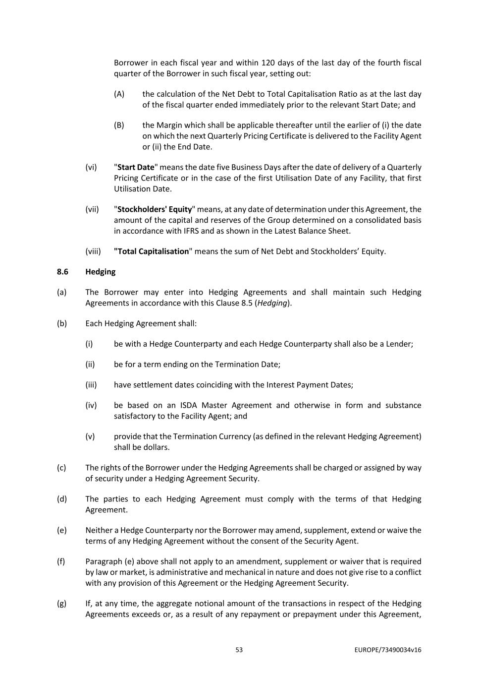 53 EUROPE/73490034v16 Borrower in each fiscal year and within 120 days of the last day of the fourth fiscal quarter of the Borrower in such fiscal year, setting out: (A) the calculation of the Net Debt to Total Capitalisation Ratio as at the last day of the fiscal quarter ended immediately prior to the relevant Start Date; and (B) the Margin which shall be applicable thereafter until the earlier of (i) the date on which the next Quarterly Pricing Certificate is delivered to the Facility Agent or (ii) the End Date. (vi) "Start Date" means the date five Business Days after the date of delivery of a Quarterly Pricing Certificate or in the case of the first Utilisation Date of any Facility, that first Utilisation Date. (vii) "Stockholders' Equity" means, at any date of determination under this Agreement, the amount of the capital and reserves of the Group determined on a consolidated basis in accordance with IFRS and as shown in the Latest Balance Sheet. (viii) "Total Capitalisation" means the sum of Net Debt and Stockholders’ Equity. 8.6 Hedging (a) The Borrower may enter into Hedging Agreements and shall maintain such Hedging Agreements in accordance with this Clause 8.5 (Hedging). (b) Each Hedging Agreement shall: (i) be with a Hedge Counterparty and each Hedge Counterparty shall also be a Lender; (ii) be for a term ending on the Termination Date; (iii) have settlement dates coinciding with the Interest Payment Dates; (iv) be based on an ISDA Master Agreement and otherwise in form and substance satisfactory to the Facility Agent; and (v) provide that the Termination Currency (as defined in the relevant Hedging Agreement) shall be dollars. (c) The rights of the Borrower under the Hedging Agreements shall be charged or assigned by way of security under a Hedging Agreement Security. (d) The parties to each Hedging Agreement must comply with the terms of that Hedging Agreement. (e) Neither a Hedge Counterparty nor the Borrower may amend, supplement, extend or waive the terms of any Hedging Agreement without the consent of the Security Agent. (f) Paragraph (e) above shall not apply to an amendment, supplement or waiver that is required by law or market, is administrative and mechanical in nature and does not give rise to a conflict with any provision of this Agreement or the Hedging Agreement Security. (g) If, at any time, the aggregate notional amount of the transactions in respect of the Hedging Agreements exceeds or, as a result of any repayment or prepayment under this Agreement,