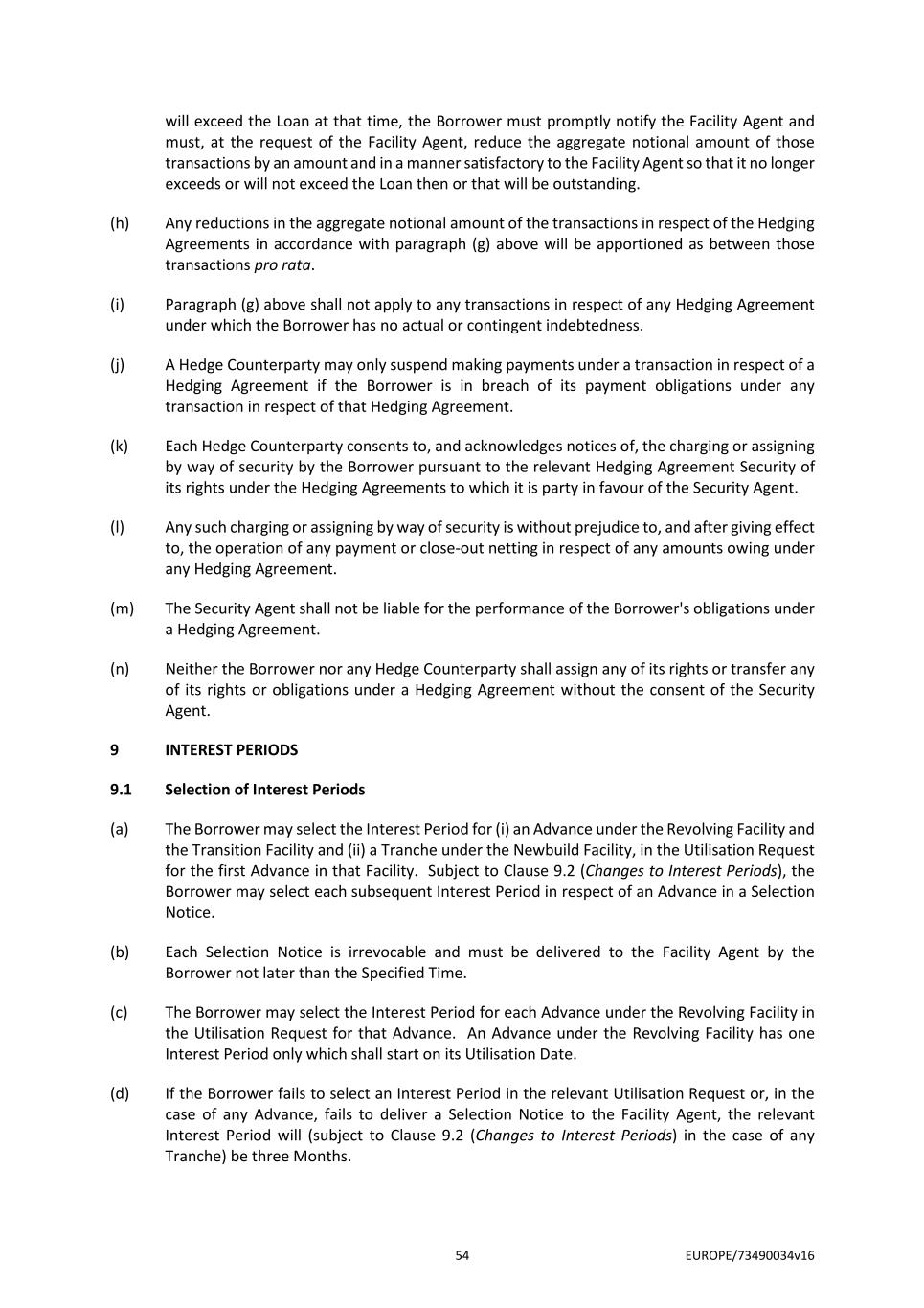 54 EUROPE/73490034v16 will exceed the Loan at that time, the Borrower must promptly notify the Facility Agent and must, at the request of the Facility Agent, reduce the aggregate notional amount of those transactions by an amount and in a manner satisfactory to the Facility Agent so that it no longer exceeds or will not exceed the Loan then or that will be outstanding. (h) Any reductions in the aggregate notional amount of the transactions in respect of the Hedging Agreements in accordance with paragraph (g) above will be apportioned as between those transactions pro rata. (i) Paragraph (g) above shall not apply to any transactions in respect of any Hedging Agreement under which the Borrower has no actual or contingent indebtedness. (j) A Hedge Counterparty may only suspend making payments under a transaction in respect of a Hedging Agreement if the Borrower is in breach of its payment obligations under any transaction in respect of that Hedging Agreement. (k) Each Hedge Counterparty consents to, and acknowledges notices of, the charging or assigning by way of security by the Borrower pursuant to the relevant Hedging Agreement Security of its rights under the Hedging Agreements to which it is party in favour of the Security Agent. (l) Any such charging or assigning by way of security is without prejudice to, and after giving effect to, the operation of any payment or close-out netting in respect of any amounts owing under any Hedging Agreement. (m) The Security Agent shall not be liable for the performance of the Borrower's obligations under a Hedging Agreement. (n) Neither the Borrower nor any Hedge Counterparty shall assign any of its rights or transfer any of its rights or obligations under a Hedging Agreement without the consent of the Security Agent. 9 INTEREST PERIODS 9.1 Selection of Interest Periods (a) The Borrower may select the Interest Period for (i) an Advance under the Revolving Facility and the Transition Facility and (ii) a Tranche under the Newbuild Facility, in the Utilisation Request for the first Advance in that Facility. Subject to Clause 9.2 (Changes to Interest Periods), the Borrower may select each subsequent Interest Period in respect of an Advance in a Selection Notice. (b) Each Selection Notice is irrevocable and must be delivered to the Facility Agent by the Borrower not later than the Specified Time. (c) The Borrower may select the Interest Period for each Advance under the Revolving Facility in the Utilisation Request for that Advance. An Advance under the Revolving Facility has one Interest Period only which shall start on its Utilisation Date. (d) If the Borrower fails to select an Interest Period in the relevant Utilisation Request or, in the case of any Advance, fails to deliver a Selection Notice to the Facility Agent, the relevant Interest Period will (subject to Clause 9.2 (Changes to Interest Periods) in the case of any Tranche) be three Months.