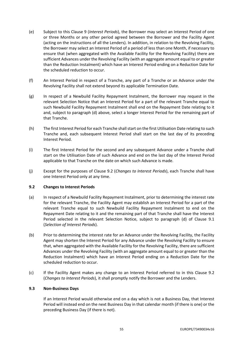 55 EUROPE/73490034v16 (e) Subject to this Clause 9 (Interest Periods), the Borrower may select an Interest Period of one or three Months or any other period agreed between the Borrower and the Facility Agent (acting on the instructions of all the Lenders). In addition, in relation to the Revolving Facility, the Borrower may select an Interest Period of a period of less than one Month, if necessary to ensure that (when aggregated with the Available Facility for the Revolving Facility) there are sufficient Advances under the Revolving Facility (with an aggregate amount equal to or greater than the Reduction Instalment) which have an Interest Period ending on a Reduction Date for the scheduled reduction to occur. (f) An Interest Period in respect of a Tranche, any part of a Tranche or an Advance under the Revolving Facility shall not extend beyond its applicable Termination Date. (g) In respect of a Newbuild Facility Repayment Instalment, the Borrower may request in the relevant Selection Notice that an Interest Period for a part of the relevant Tranche equal to such Newbuild Facility Repayment Instalment shall end on the Repayment Date relating to it and, subject to paragraph (d) above, select a longer Interest Period for the remaining part of that Tranche. (h) The first Interest Period for each Tranche shall start on the first Utilisation Date relating to such Tranche and, each subsequent Interest Period shall start on the last day of its preceding Interest Period. (i) The first Interest Period for the second and any subsequent Advance under a Tranche shall start on the Utilisation Date of such Advance and end on the last day of the Interest Period applicable to that Tranche on the date on which such Advance is made. (j) Except for the purposes of Clause 9.2 (Changes to Interest Periods), each Tranche shall have one Interest Period only at any time. 9.2 Changes to Interest Periods (a) In respect of a Newbuild Facility Repayment Instalment, prior to determining the interest rate for the relevant Tranche, the Facility Agent may establish an Interest Period for a part of the relevant Tranche equal to such Newbuild Facility Repayment Instalment to end on the Repayment Date relating to it and the remaining part of that Tranche shall have the Interest Period selected in the relevant Selection Notice, subject to paragraph (d) of Clause 9.1 (Selection of Interest Periods). (b) Prior to determining the interest rate for an Advance under the Revolving Facility, the Facility Agent may shorten the Interest Period for any Advance under the Revolving Facility to ensure that, when aggregated with the Available Facility for the Revolving Facility, there are sufficient Advances under the Revolving Facility (with an aggregate amount equal to or greater than the Reduction Instalment) which have an Interest Period ending on a Reduction Date for the scheduled reduction to occur. (c) If the Facility Agent makes any change to an Interest Period referred to in this Clause 9.2 (Changes to Interest Periods), it shall promptly notify the Borrower and the Lenders. 9.3 Non-Business Days If an Interest Period would otherwise end on a day which is not a Business Day, that Interest Period will instead end on the next Business Day in that calendar month (if there is one) or the preceding Business Day (if there is not).