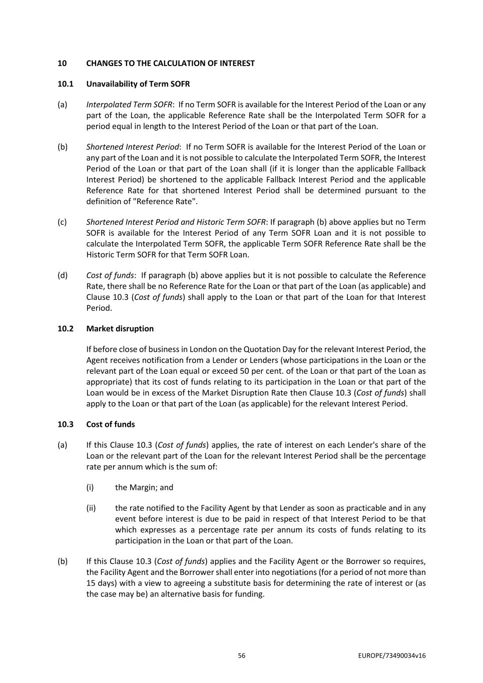 56 EUROPE/73490034v16 10 CHANGES TO THE CALCULATION OF INTEREST 10.1 Unavailability of Term SOFR (a) Interpolated Term SOFR: If no Term SOFR is available for the Interest Period of the Loan or any part of the Loan, the applicable Reference Rate shall be the Interpolated Term SOFR for a period equal in length to the Interest Period of the Loan or that part of the Loan. (b) Shortened Interest Period: If no Term SOFR is available for the Interest Period of the Loan or any part of the Loan and it is not possible to calculate the Interpolated Term SOFR, the Interest Period of the Loan or that part of the Loan shall (if it is longer than the applicable Fallback Interest Period) be shortened to the applicable Fallback Interest Period and the applicable Reference Rate for that shortened Interest Period shall be determined pursuant to the definition of "Reference Rate". (c) Shortened Interest Period and Historic Term SOFR: If paragraph (b) above applies but no Term SOFR is available for the Interest Period of any Term SOFR Loan and it is not possible to calculate the Interpolated Term SOFR, the applicable Term SOFR Reference Rate shall be the Historic Term SOFR for that Term SOFR Loan. (d) Cost of funds: If paragraph (b) above applies but it is not possible to calculate the Reference Rate, there shall be no Reference Rate for the Loan or that part of the Loan (as applicable) and Clause 10.3 (Cost of funds) shall apply to the Loan or that part of the Loan for that Interest Period. 10.2 Market disruption If before close of business in London on the Quotation Day for the relevant Interest Period, the Agent receives notification from a Lender or Lenders (whose participations in the Loan or the relevant part of the Loan equal or exceed 50 per cent. of the Loan or that part of the Loan as appropriate) that its cost of funds relating to its participation in the Loan or that part of the Loan would be in excess of the Market Disruption Rate then Clause 10.3 (Cost of funds) shall apply to the Loan or that part of the Loan (as applicable) for the relevant Interest Period. 10.3 Cost of funds (a) If this Clause 10.3 (Cost of funds) applies, the rate of interest on each Lender's share of the Loan or the relevant part of the Loan for the relevant Interest Period shall be the percentage rate per annum which is the sum of: (i) the Margin; and (ii) the rate notified to the Facility Agent by that Lender as soon as practicable and in any event before interest is due to be paid in respect of that Interest Period to be that which expresses as a percentage rate per annum its costs of funds relating to its participation in the Loan or that part of the Loan. (b) If this Clause 10.3 (Cost of funds) applies and the Facility Agent or the Borrower so requires, the Facility Agent and the Borrower shall enter into negotiations (for a period of not more than 15 days) with a view to agreeing a substitute basis for determining the rate of interest or (as the case may be) an alternative basis for funding.