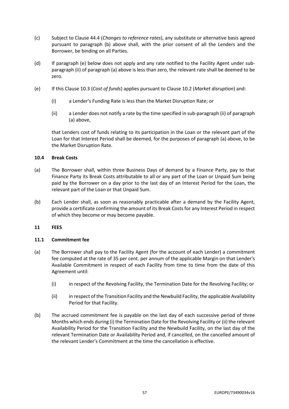 57 EUROPE/73490034v16 (c) Subject to Clause 44.4 (Changes to reference rates), any substitute or alternative basis agreed pursuant to paragraph (b) above shall, with the prior consent of all the Lenders and the Borrower, be binding on all Parties. (d) If paragraph (e) below does not apply and any rate notified to the Facility Agent under sub- paragraph (ii) of paragraph (a) above is less than zero, the relevant rate shall be deemed to be zero. (e) If this Clause 10.3 (Cost of funds) applies pursuant to Clause 10.2 (Market disruption) and: (i) a Lender's Funding Rate is less than the Market Disruption Rate; or (ii) a Lender does not notify a rate by the time specified in sub-paragraph (ii) of paragraph (a) above, that Lenders cost of funds relating to its participation in the Loan or the relevant part of the Loan for that Interest Period shall be deemed, for the purposes of paragraph (a) above, to be the Market Disruption Rate. 10.4 Break Costs (a) The Borrower shall, within three Business Days of demand by a Finance Party, pay to that Finance Party its Break Costs attributable to all or any part of the Loan or Unpaid Sum being paid by the Borrower on a day prior to the last day of an Interest Period for the Loan, the relevant part of the Loan or that Unpaid Sum. (b) Each Lender shall, as soon as reasonably practicable after a demand by the Facility Agent, provide a certificate confirming the amount of its Break Costs for any Interest Period in respect of which they become or may become payable. 11 FEES 11.1 Commitment fee (a) The Borrower shall pay to the Facility Agent (for the account of each Lender) a commitment fee computed at the rate of 35 per cent. per annum of the applicable Margin on that Lender's Available Commitment in respect of each Facility from time to time from the date of this Agreement until: (i) in respect of the Revolving Facility, the Termination Date for the Revolving Facility; or (ii) in respect of the Transition Facility and the Newbuild Facility, the applicable Availability Period for that Facility. (b) The accrued commitment fee is payable on the last day of each successive period of three Months which ends during (i) the Termination Date for the Revolving Facility or (ii) the relevant Availability Period for the Transition Facility and the Newbuild Facility, on the last day of the relevant Termination Date or Availability Period and, if cancelled, on the cancelled amount of the relevant Lender's Commitment at the time the cancellation is effective.