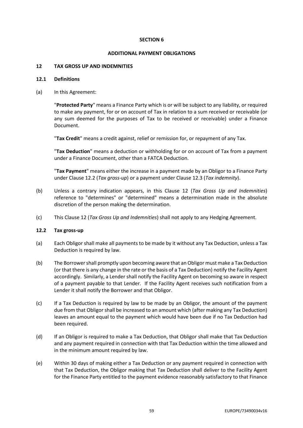 59 EUROPE/73490034v16 SECTION 6 ADDITIONAL PAYMENT OBLIGATIONS 12 TAX GROSS UP AND INDEMNITIES 12.1 Definitions (a) In this Agreement: "Protected Party" means a Finance Party which is or will be subject to any liability, or required to make any payment, for or on account of Tax in relation to a sum received or receivable (or any sum deemed for the purposes of Tax to be received or receivable) under a Finance Document. "Tax Credit" means a credit against, relief or remission for, or repayment of any Tax. "Tax Deduction" means a deduction or withholding for or on account of Tax from a payment under a Finance Document, other than a FATCA Deduction. "Tax Payment" means either the increase in a payment made by an Obligor to a Finance Party under Clause 12.2 (Tax gross-up) or a payment under Clause 12.3 (Tax indemnity). (b) Unless a contrary indication appears, in this Clause 12 (Tax Gross Up and Indemnities) reference to "determines" or "determined" means a determination made in the absolute discretion of the person making the determination. (c) This Clause 12 (Tax Gross Up and Indemnities) shall not apply to any Hedging Agreement. 12.2 Tax gross-up (a) Each Obligor shall make all payments to be made by it without any Tax Deduction, unless a Tax Deduction is required by law. (b) The Borrower shall promptly upon becoming aware that an Obligor must make a Tax Deduction (or that there is any change in the rate or the basis of a Tax Deduction) notify the Facility Agent accordingly. Similarly, a Lender shall notify the Facility Agent on becoming so aware in respect of a payment payable to that Lender. If the Facility Agent receives such notification from a Lender it shall notify the Borrower and that Obligor. (c) If a Tax Deduction is required by law to be made by an Obligor, the amount of the payment due from that Obligor shall be increased to an amount which (after making any Tax Deduction) leaves an amount equal to the payment which would have been due if no Tax Deduction had been required. (d) If an Obligor is required to make a Tax Deduction, that Obligor shall make that Tax Deduction and any payment required in connection with that Tax Deduction within the time allowed and in the minimum amount required by law. (e) Within 30 days of making either a Tax Deduction or any payment required in connection with that Tax Deduction, the Obligor making that Tax Deduction shall deliver to the Facility Agent for the Finance Party entitled to the payment evidence reasonably satisfactory to that Finance