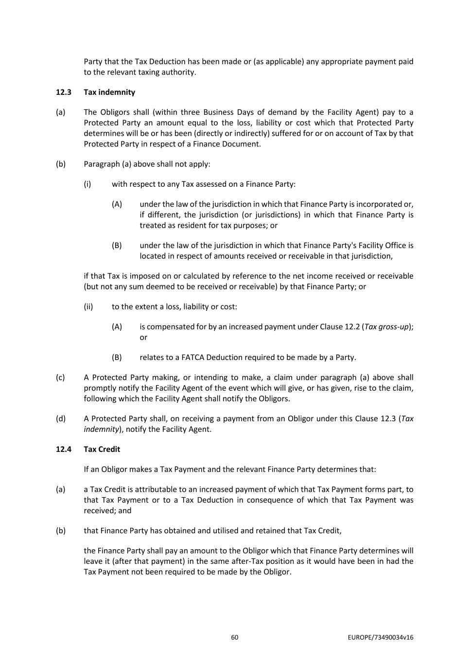 60 EUROPE/73490034v16 Party that the Tax Deduction has been made or (as applicable) any appropriate payment paid to the relevant taxing authority. 12.3 Tax indemnity (a) The Obligors shall (within three Business Days of demand by the Facility Agent) pay to a Protected Party an amount equal to the loss, liability or cost which that Protected Party determines will be or has been (directly or indirectly) suffered for or on account of Tax by that Protected Party in respect of a Finance Document. (b) Paragraph (a) above shall not apply: (i) with respect to any Tax assessed on a Finance Party: (A) under the law of the jurisdiction in which that Finance Party is incorporated or, if different, the jurisdiction (or jurisdictions) in which that Finance Party is treated as resident for tax purposes; or (B) under the law of the jurisdiction in which that Finance Party's Facility Office is located in respect of amounts received or receivable in that jurisdiction, if that Tax is imposed on or calculated by reference to the net income received or receivable (but not any sum deemed to be received or receivable) by that Finance Party; or (ii) to the extent a loss, liability or cost: (A) is compensated for by an increased payment under Clause 12.2 (Tax gross-up); or (B) relates to a FATCA Deduction required to be made by a Party. (c) A Protected Party making, or intending to make, a claim under paragraph (a) above shall promptly notify the Facility Agent of the event which will give, or has given, rise to the claim, following which the Facility Agent shall notify the Obligors. (d) A Protected Party shall, on receiving a payment from an Obligor under this Clause 12.3 (Tax indemnity), notify the Facility Agent. 12.4 Tax Credit If an Obligor makes a Tax Payment and the relevant Finance Party determines that: (a) a Tax Credit is attributable to an increased payment of which that Tax Payment forms part, to that Tax Payment or to a Tax Deduction in consequence of which that Tax Payment was received; and (b) that Finance Party has obtained and utilised and retained that Tax Credit, the Finance Party shall pay an amount to the Obligor which that Finance Party determines will leave it (after that payment) in the same after-Tax position as it would have been in had the Tax Payment not been required to be made by the Obligor.