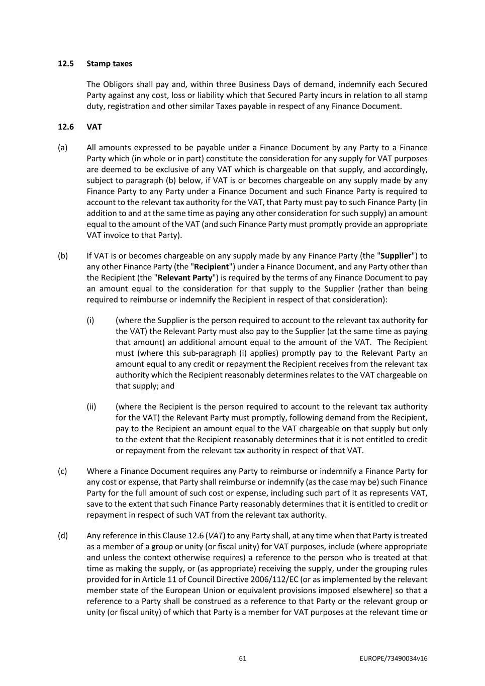 61 EUROPE/73490034v16 12.5 Stamp taxes The Obligors shall pay and, within three Business Days of demand, indemnify each Secured Party against any cost, loss or liability which that Secured Party incurs in relation to all stamp duty, registration and other similar Taxes payable in respect of any Finance Document. 12.6 VAT (a) All amounts expressed to be payable under a Finance Document by any Party to a Finance Party which (in whole or in part) constitute the consideration for any supply for VAT purposes are deemed to be exclusive of any VAT which is chargeable on that supply, and accordingly, subject to paragraph (b) below, if VAT is or becomes chargeable on any supply made by any Finance Party to any Party under a Finance Document and such Finance Party is required to account to the relevant tax authority for the VAT, that Party must pay to such Finance Party (in addition to and at the same time as paying any other consideration for such supply) an amount equal to the amount of the VAT (and such Finance Party must promptly provide an appropriate VAT invoice to that Party). (b) If VAT is or becomes chargeable on any supply made by any Finance Party (the "Supplier") to any other Finance Party (the "Recipient") under a Finance Document, and any Party other than the Recipient (the "Relevant Party") is required by the terms of any Finance Document to pay an amount equal to the consideration for that supply to the Supplier (rather than being required to reimburse or indemnify the Recipient in respect of that consideration): (i) (where the Supplier is the person required to account to the relevant tax authority for the VAT) the Relevant Party must also pay to the Supplier (at the same time as paying that amount) an additional amount equal to the amount of the VAT. The Recipient must (where this sub-paragraph (i) applies) promptly pay to the Relevant Party an amount equal to any credit or repayment the Recipient receives from the relevant tax authority which the Recipient reasonably determines relates to the VAT chargeable on that supply; and (ii) (where the Recipient is the person required to account to the relevant tax authority for the VAT) the Relevant Party must promptly, following demand from the Recipient, pay to the Recipient an amount equal to the VAT chargeable on that supply but only to the extent that the Recipient reasonably determines that it is not entitled to credit or repayment from the relevant tax authority in respect of that VAT. (c) Where a Finance Document requires any Party to reimburse or indemnify a Finance Party for any cost or expense, that Party shall reimburse or indemnify (as the case may be) such Finance Party for the full amount of such cost or expense, including such part of it as represents VAT, save to the extent that such Finance Party reasonably determines that it is entitled to credit or repayment in respect of such VAT from the relevant tax authority. (d) Any reference in this Clause 12.6 (VAT) to any Party shall, at any time when that Party is treated as a member of a group or unity (or fiscal unity) for VAT purposes, include (where appropriate and unless the context otherwise requires) a reference to the person who is treated at that time as making the supply, or (as appropriate) receiving the supply, under the grouping rules provided for in Article 11 of Council Directive 2006/112/EC (or as implemented by the relevant member state of the European Union or equivalent provisions imposed elsewhere) so that a reference to a Party shall be construed as a reference to that Party or the relevant group or unity (or fiscal unity) of which that Party is a member for VAT purposes at the relevant time or