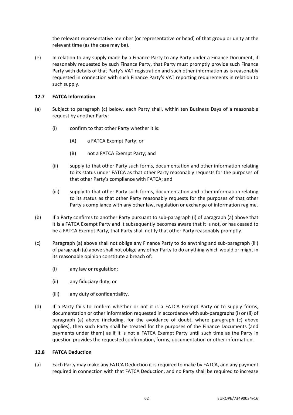 62 EUROPE/73490034v16 the relevant representative member (or representative or head) of that group or unity at the relevant time (as the case may be). (e) In relation to any supply made by a Finance Party to any Party under a Finance Document, if reasonably requested by such Finance Party, that Party must promptly provide such Finance Party with details of that Party's VAT registration and such other information as is reasonably requested in connection with such Finance Party's VAT reporting requirements in relation to such supply. 12.7 FATCA Information (a) Subject to paragraph (c) below, each Party shall, within ten Business Days of a reasonable request by another Party: (i) confirm to that other Party whether it is: (A) a FATCA Exempt Party; or (B) not a FATCA Exempt Party; and (ii) supply to that other Party such forms, documentation and other information relating to its status under FATCA as that other Party reasonably requests for the purposes of that other Party's compliance with FATCA; and (iii) supply to that other Party such forms, documentation and other information relating to its status as that other Party reasonably requests for the purposes of that other Party's compliance with any other law, regulation or exchange of information regime. (b) If a Party confirms to another Party pursuant to sub-paragraph (i) of paragraph (a) above that it is a FATCA Exempt Party and it subsequently becomes aware that it is not, or has ceased to be a FATCA Exempt Party, that Party shall notify that other Party reasonably promptly. (c) Paragraph (a) above shall not oblige any Finance Party to do anything and sub-paragraph (iii) of paragraph (a) above shall not oblige any other Party to do anything which would or might in its reasonable opinion constitute a breach of: (i) any law or regulation; (ii) any fiduciary duty; or (iii) any duty of confidentiality. (d) If a Party fails to confirm whether or not it is a FATCA Exempt Party or to supply forms, documentation or other information requested in accordance with sub-paragraphs (i) or (ii) of paragraph (a) above (including, for the avoidance of doubt, where paragraph (c) above applies), then such Party shall be treated for the purposes of the Finance Documents (and payments under them) as if it is not a FATCA Exempt Party until such time as the Party in question provides the requested confirmation, forms, documentation or other information. 12.8 FATCA Deduction (a) Each Party may make any FATCA Deduction it is required to make by FATCA, and any payment required in connection with that FATCA Deduction, and no Party shall be required to increase