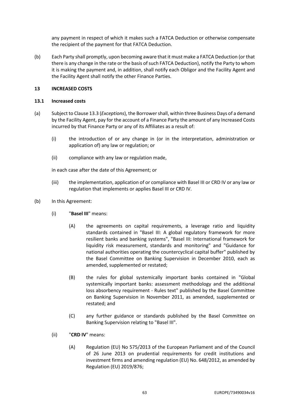 63 EUROPE/73490034v16 any payment in respect of which it makes such a FATCA Deduction or otherwise compensate the recipient of the payment for that FATCA Deduction. (b) Each Party shall promptly, upon becoming aware that it must make a FATCA Deduction (or that there is any change in the rate or the basis of such FATCA Deduction), notify the Party to whom it is making the payment and, in addition, shall notify each Obligor and the Facility Agent and the Facility Agent shall notify the other Finance Parties. 13 INCREASED COSTS 13.1 Increased costs (a) Subject to Clause 13.3 (Exceptions), the Borrower shall, within three Business Days of a demand by the Facility Agent, pay for the account of a Finance Party the amount of any Increased Costs incurred by that Finance Party or any of its Affiliates as a result of: (i) the introduction of or any change in (or in the interpretation, administration or application of) any law or regulation; or (ii) compliance with any law or regulation made, in each case after the date of this Agreement; or (iii) the implementation, application of or compliance with Basel III or CRD IV or any law or regulation that implements or applies Basel III or CRD IV. (b) In this Agreement: (i) "Basel III" means: (A) the agreements on capital requirements, a leverage ratio and liquidity standards contained in "Basel III: A global regulatory framework for more resilient banks and banking systems", "Basel III: International framework for liquidity risk measurement, standards and monitoring" and "Guidance for national authorities operating the countercyclical capital buffer" published by the Basel Committee on Banking Supervision in December 2010, each as amended, supplemented or restated; (B) the rules for global systemically important banks contained in "Global systemically important banks: assessment methodology and the additional loss absorbency requirement - Rules text" published by the Basel Committee on Banking Supervision in November 2011, as amended, supplemented or restated; and (C) any further guidance or standards published by the Basel Committee on Banking Supervision relating to "Basel III". (ii) "CRD IV" means: (A) Regulation (EU) No 575/2013 of the European Parliament and of the Council of 26 June 2013 on prudential requirements for credit institutions and investment firms and amending regulation (EU) No. 648/2012, as amended by Regulation (EU) 2019/876;