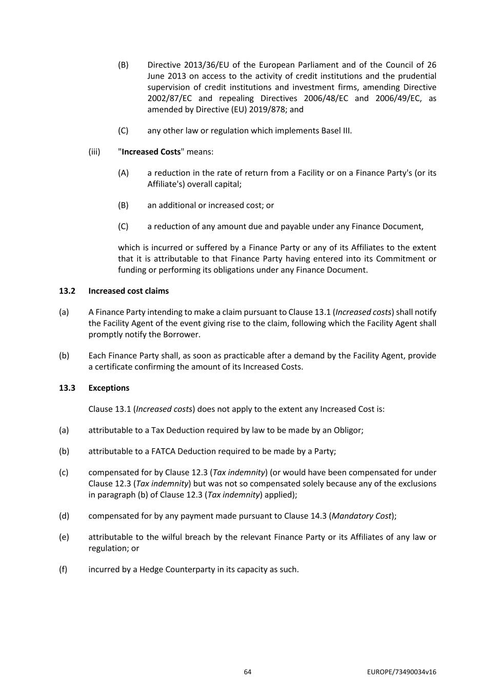 64 EUROPE/73490034v16 (B) Directive 2013/36/EU of the European Parliament and of the Council of 26 June 2013 on access to the activity of credit institutions and the prudential supervision of credit institutions and investment firms, amending Directive 2002/87/EC and repealing Directives 2006/48/EC and 2006/49/EC, as amended by Directive (EU) 2019/878; and (C) any other law or regulation which implements Basel III. (iii) "Increased Costs" means: (A) a reduction in the rate of return from a Facility or on a Finance Party's (or its Affiliate's) overall capital; (B) an additional or increased cost; or (C) a reduction of any amount due and payable under any Finance Document, which is incurred or suffered by a Finance Party or any of its Affiliates to the extent that it is attributable to that Finance Party having entered into its Commitment or funding or performing its obligations under any Finance Document. 13.2 Increased cost claims (a) A Finance Party intending to make a claim pursuant to Clause 13.1 (Increased costs) shall notify the Facility Agent of the event giving rise to the claim, following which the Facility Agent shall promptly notify the Borrower. (b) Each Finance Party shall, as soon as practicable after a demand by the Facility Agent, provide a certificate confirming the amount of its Increased Costs. 13.3 Exceptions Clause 13.1 (Increased costs) does not apply to the extent any Increased Cost is: (a) attributable to a Tax Deduction required by law to be made by an Obligor; (b) attributable to a FATCA Deduction required to be made by a Party; (c) compensated for by Clause 12.3 (Tax indemnity) (or would have been compensated for under Clause 12.3 (Tax indemnity) but was not so compensated solely because any of the exclusions in paragraph (b) of Clause 12.3 (Tax indemnity) applied); (d) compensated for by any payment made pursuant to Clause 14.3 (Mandatory Cost); (e) attributable to the wilful breach by the relevant Finance Party or its Affiliates of any law or regulation; or (f) incurred by a Hedge Counterparty in its capacity as such.