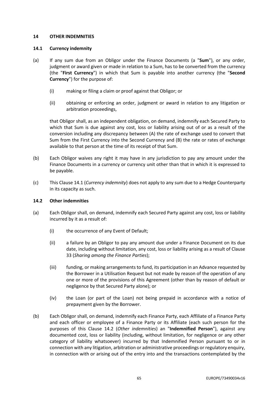 65 EUROPE/73490034v16 14 OTHER INDEMNITIES 14.1 Currency indemnity (a) If any sum due from an Obligor under the Finance Documents (a "Sum"), or any order, judgment or award given or made in relation to a Sum, has to be converted from the currency (the "First Currency") in which that Sum is payable into another currency (the "Second Currency") for the purpose of: (i) making or filing a claim or proof against that Obligor; or (ii) obtaining or enforcing an order, judgment or award in relation to any litigation or arbitration proceedings, that Obligor shall, as an independent obligation, on demand, indemnify each Secured Party to which that Sum is due against any cost, loss or liability arising out of or as a result of the conversion including any discrepancy between (A) the rate of exchange used to convert that Sum from the First Currency into the Second Currency and (B) the rate or rates of exchange available to that person at the time of its receipt of that Sum. (b) Each Obligor waives any right it may have in any jurisdiction to pay any amount under the Finance Documents in a currency or currency unit other than that in which it is expressed to be payable. (c) This Clause 14.1 (Currency indemnity) does not apply to any sum due to a Hedge Counterparty in its capacity as such. 14.2 Other indemnities (a) Each Obligor shall, on demand, indemnify each Secured Party against any cost, loss or liability incurred by it as a result of: (i) the occurrence of any Event of Default; (ii) a failure by an Obligor to pay any amount due under a Finance Document on its due date, including without limitation, any cost, loss or liability arising as a result of Clause 33 (Sharing among the Finance Parties); (iii) funding, or making arrangements to fund, its participation in an Advance requested by the Borrower in a Utilisation Request but not made by reason of the operation of any one or more of the provisions of this Agreement (other than by reason of default or negligence by that Secured Party alone); or (iv) the Loan (or part of the Loan) not being prepaid in accordance with a notice of prepayment given by the Borrower. (b) Each Obligor shall, on demand, indemnify each Finance Party, each Affiliate of a Finance Party and each officer or employee of a Finance Party or its Affiliate (each such person for the purposes of this Clause 14.2 (Other indemnities) an "Indemnified Person"), against any documented cost, loss or liability (including, without limitation, for negligence or any other category of liability whatsoever) incurred by that Indemnified Person pursuant to or in connection with any litigation, arbitration or administrative proceedings or regulatory enquiry, in connection with or arising out of the entry into and the transactions contemplated by the
