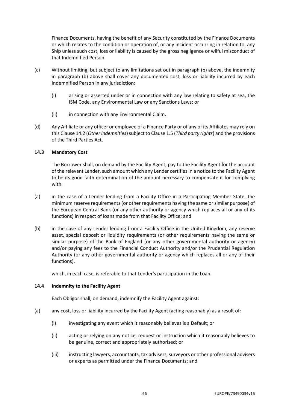 66 EUROPE/73490034v16 Finance Documents, having the benefit of any Security constituted by the Finance Documents or which relates to the condition or operation of, or any incident occurring in relation to, any Ship unless such cost, loss or liability is caused by the gross negligence or wilful misconduct of that Indemnified Person. (c) Without limiting, but subject to any limitations set out in paragraph (b) above, the indemnity in paragraph (b) above shall cover any documented cost, loss or liability incurred by each Indemnified Person in any jurisdiction: (i) arising or asserted under or in connection with any law relating to safety at sea, the ISM Code, any Environmental Law or any Sanctions Laws; or (ii) in connection with any Environmental Claim. (d) Any Affiliate or any officer or employee of a Finance Party or of any of its Affiliates may rely on this Clause 14.2 (Other indemnities) subject to Clause 1.5 (Third party rights) and the provisions of the Third Parties Act. 14.3 Mandatory Cost The Borrower shall, on demand by the Facility Agent, pay to the Facility Agent for the account of the relevant Lender, such amount which any Lender certifies in a notice to the Facility Agent to be its good faith determination of the amount necessary to compensate it for complying with: (a) in the case of a Lender lending from a Facility Office in a Participating Member State, the minimum reserve requirements (or other requirements having the same or similar purpose) of the European Central Bank (or any other authority or agency which replaces all or any of its functions) in respect of loans made from that Facility Office; and (b) in the case of any Lender lending from a Facility Office in the United Kingdom, any reserve asset, special deposit or liquidity requirements (or other requirements having the same or similar purpose) of the Bank of England (or any other governmental authority or agency) and/or paying any fees to the Financial Conduct Authority and/or the Prudential Regulation Authority (or any other governmental authority or agency which replaces all or any of their functions), which, in each case, is referable to that Lender's participation in the Loan. 14.4 Indemnity to the Facility Agent Each Obligor shall, on demand, indemnify the Facility Agent against: (a) any cost, loss or liability incurred by the Facility Agent (acting reasonably) as a result of: (i) investigating any event which it reasonably believes is a Default; or (ii) acting or relying on any notice, request or instruction which it reasonably believes to be genuine, correct and appropriately authorised; or (iii) instructing lawyers, accountants, tax advisers, surveyors or other professional advisers or experts as permitted under the Finance Documents; and