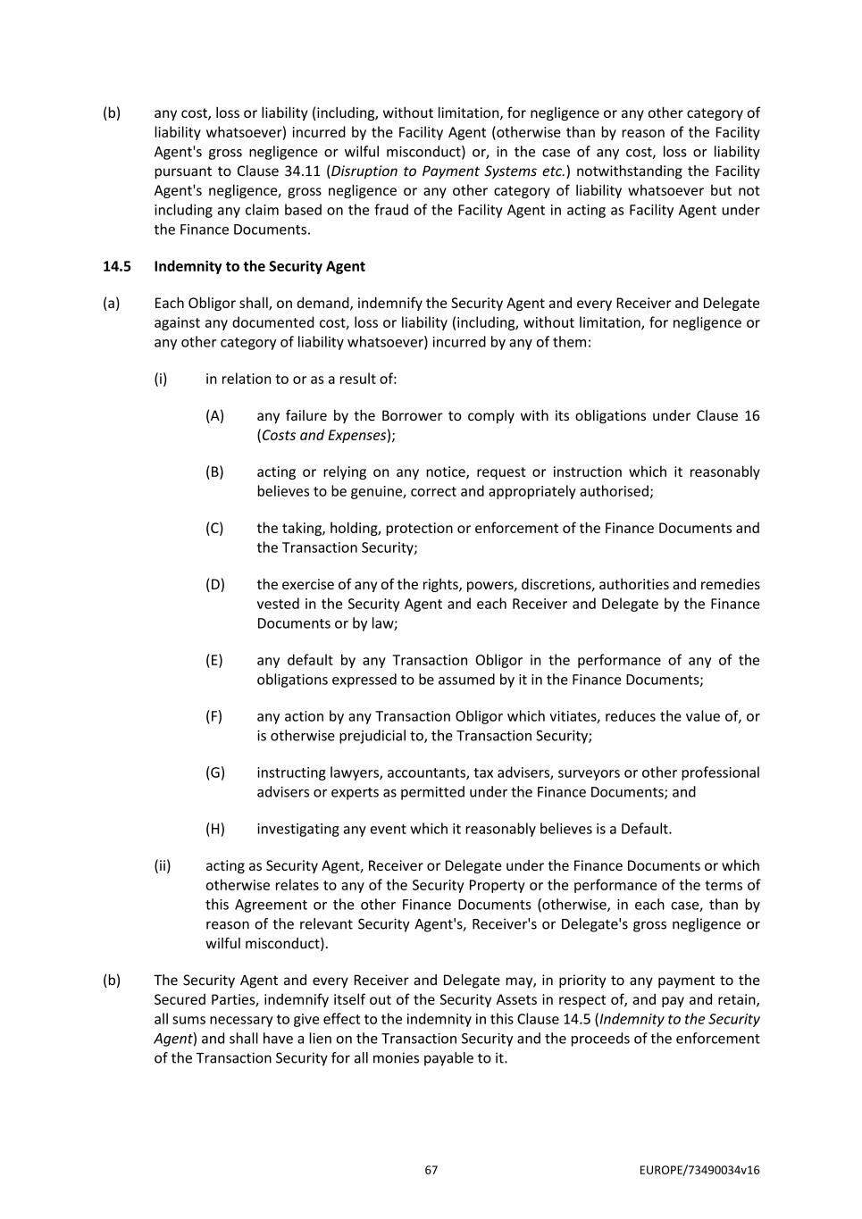 67 EUROPE/73490034v16 (b) any cost, loss or liability (including, without limitation, for negligence or any other category of liability whatsoever) incurred by the Facility Agent (otherwise than by reason of the Facility Agent's gross negligence or wilful misconduct) or, in the case of any cost, loss or liability pursuant to Clause 34.11 (Disruption to Payment Systems etc.) notwithstanding the Facility Agent's negligence, gross negligence or any other category of liability whatsoever but not including any claim based on the fraud of the Facility Agent in acting as Facility Agent under the Finance Documents. 14.5 Indemnity to the Security Agent (a) Each Obligor shall, on demand, indemnify the Security Agent and every Receiver and Delegate against any documented cost, loss or liability (including, without limitation, for negligence or any other category of liability whatsoever) incurred by any of them: (i) in relation to or as a result of: (A) any failure by the Borrower to comply with its obligations under Clause 16 (Costs and Expenses); (B) acting or relying on any notice, request or instruction which it reasonably believes to be genuine, correct and appropriately authorised; (C) the taking, holding, protection or enforcement of the Finance Documents and the Transaction Security; (D) the exercise of any of the rights, powers, discretions, authorities and remedies vested in the Security Agent and each Receiver and Delegate by the Finance Documents or by law; (E) any default by any Transaction Obligor in the performance of any of the obligations expressed to be assumed by it in the Finance Documents; (F) any action by any Transaction Obligor which vitiates, reduces the value of, or is otherwise prejudicial to, the Transaction Security; (G) instructing lawyers, accountants, tax advisers, surveyors or other professional advisers or experts as permitted under the Finance Documents; and (H) investigating any event which it reasonably believes is a Default. (ii) acting as Security Agent, Receiver or Delegate under the Finance Documents or which otherwise relates to any of the Security Property or the performance of the terms of this Agreement or the other Finance Documents (otherwise, in each case, than by reason of the relevant Security Agent's, Receiver's or Delegate's gross negligence or wilful misconduct). (b) The Security Agent and every Receiver and Delegate may, in priority to any payment to the Secured Parties, indemnify itself out of the Security Assets in respect of, and pay and retain, all sums necessary to give effect to the indemnity in this Clause 14.5 (Indemnity to the Security Agent) and shall have a lien on the Transaction Security and the proceeds of the enforcement of the Transaction Security for all monies payable to it.