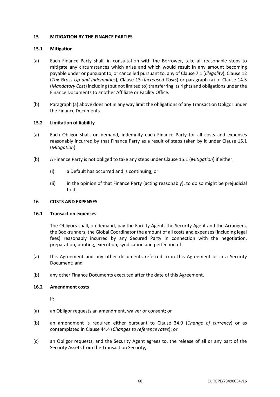 68 EUROPE/73490034v16 15 MITIGATION BY THE FINANCE PARTIES 15.1 Mitigation (a) Each Finance Party shall, in consultation with the Borrower, take all reasonable steps to mitigate any circumstances which arise and which would result in any amount becoming payable under or pursuant to, or cancelled pursuant to, any of Clause 7.1 (Illegality), Clause 12 (Tax Gross Up and Indemnities), Clause 13 (Increased Costs) or paragraph (a) of Clause 14.3 (Mandatory Cost) including (but not limited to) transferring its rights and obligations under the Finance Documents to another Affiliate or Facility Office. (b) Paragraph (a) above does not in any way limit the obligations of any Transaction Obligor under the Finance Documents. 15.2 Limitation of liability (a) Each Obligor shall, on demand, indemnify each Finance Party for all costs and expenses reasonably incurred by that Finance Party as a result of steps taken by it under Clause 15.1 (Mitigation). (b) A Finance Party is not obliged to take any steps under Clause 15.1 (Mitigation) if either: (i) a Default has occurred and is continuing; or (ii) in the opinion of that Finance Party (acting reasonably), to do so might be prejudicial to it. 16 COSTS AND EXPENSES 16.1 Transaction expenses The Obligors shall, on demand, pay the Facility Agent, the Security Agent and the Arrangers, the Bookrunners, the Global Coordinator the amount of all costs and expenses (including legal fees) reasonably incurred by any Secured Party in connection with the negotiation, preparation, printing, execution, syndication and perfection of: (a) this Agreement and any other documents referred to in this Agreement or in a Security Document; and (b) any other Finance Documents executed after the date of this Agreement. 16.2 Amendment costs If: (a) an Obligor requests an amendment, waiver or consent; or (b) an amendment is required either pursuant to Clause 34.9 (Change of currency) or as contemplated in Clause 44.4 (Changes to reference rates); or (c) an Obligor requests, and the Security Agent agrees to, the release of all or any part of the Security Assets from the Transaction Security,
