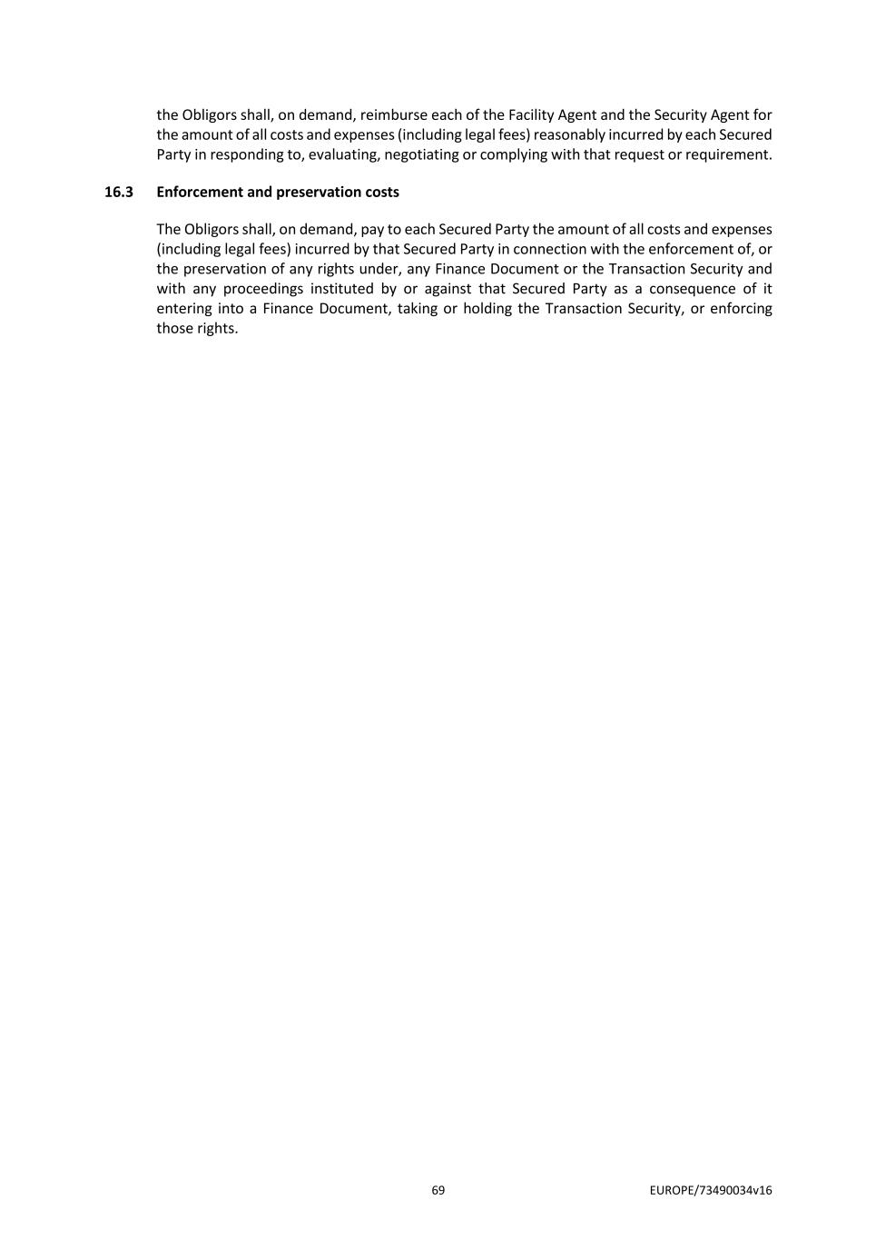 69 EUROPE/73490034v16 the Obligors shall, on demand, reimburse each of the Facility Agent and the Security Agent for the amount of all costs and expenses (including legal fees) reasonably incurred by each Secured Party in responding to, evaluating, negotiating or complying with that request or requirement. 16.3 Enforcement and preservation costs The Obligors shall, on demand, pay to each Secured Party the amount of all costs and expenses (including legal fees) incurred by that Secured Party in connection with the enforcement of, or the preservation of any rights under, any Finance Document or the Transaction Security and with any proceedings instituted by or against that Secured Party as a consequence of it entering into a Finance Document, taking or holding the Transaction Security, or enforcing those rights.