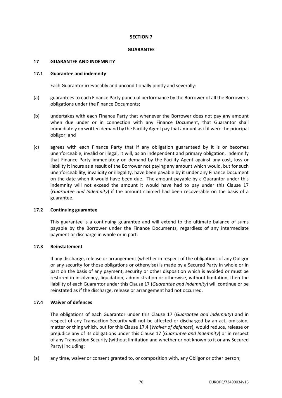 70 EUROPE/73490034v16 SECTION 7 GUARANTEE 17 GUARANTEE AND INDEMNITY 17.1 Guarantee and indemnity Each Guarantor irrevocably and unconditionally jointly and severally: (a) guarantees to each Finance Party punctual performance by the Borrower of all the Borrower's obligations under the Finance Documents; (b) undertakes with each Finance Party that whenever the Borrower does not pay any amount when due under or in connection with any Finance Document, that Guarantor shall immediately on written demand by the Facility Agent pay that amount as if it were the principal obligor; and (c) agrees with each Finance Party that if any obligation guaranteed by it is or becomes unenforceable, invalid or illegal, it will, as an independent and primary obligation, indemnify that Finance Party immediately on demand by the Facility Agent against any cost, loss or liability it incurs as a result of the Borrower not paying any amount which would, but for such unenforceability, invalidity or illegality, have been payable by it under any Finance Document on the date when it would have been due. The amount payable by a Guarantor under this indemnity will not exceed the amount it would have had to pay under this Clause 17 (Guarantee and Indemnity) if the amount claimed had been recoverable on the basis of a guarantee. 17.2 Continuing guarantee This guarantee is a continuing guarantee and will extend to the ultimate balance of sums payable by the Borrower under the Finance Documents, regardless of any intermediate payment or discharge in whole or in part. 17.3 Reinstatement If any discharge, release or arrangement (whether in respect of the obligations of any Obligor or any security for those obligations or otherwise) is made by a Secured Party in whole or in part on the basis of any payment, security or other disposition which is avoided or must be restored in insolvency, liquidation, administration or otherwise, without limitation, then the liability of each Guarantor under this Clause 17 (Guarantee and Indemnity) will continue or be reinstated as if the discharge, release or arrangement had not occurred. 17.4 Waiver of defences The obligations of each Guarantor under this Clause 17 (Guarantee and Indemnity) and in respect of any Transaction Security will not be affected or discharged by an act, omission, matter or thing which, but for this Clause 17.4 (Waiver of defences), would reduce, release or prejudice any of its obligations under this Clause 17 (Guarantee and Indemnity) or in respect of any Transaction Security (without limitation and whether or not known to it or any Secured Party) including: (a) any time, waiver or consent granted to, or composition with, any Obligor or other person;