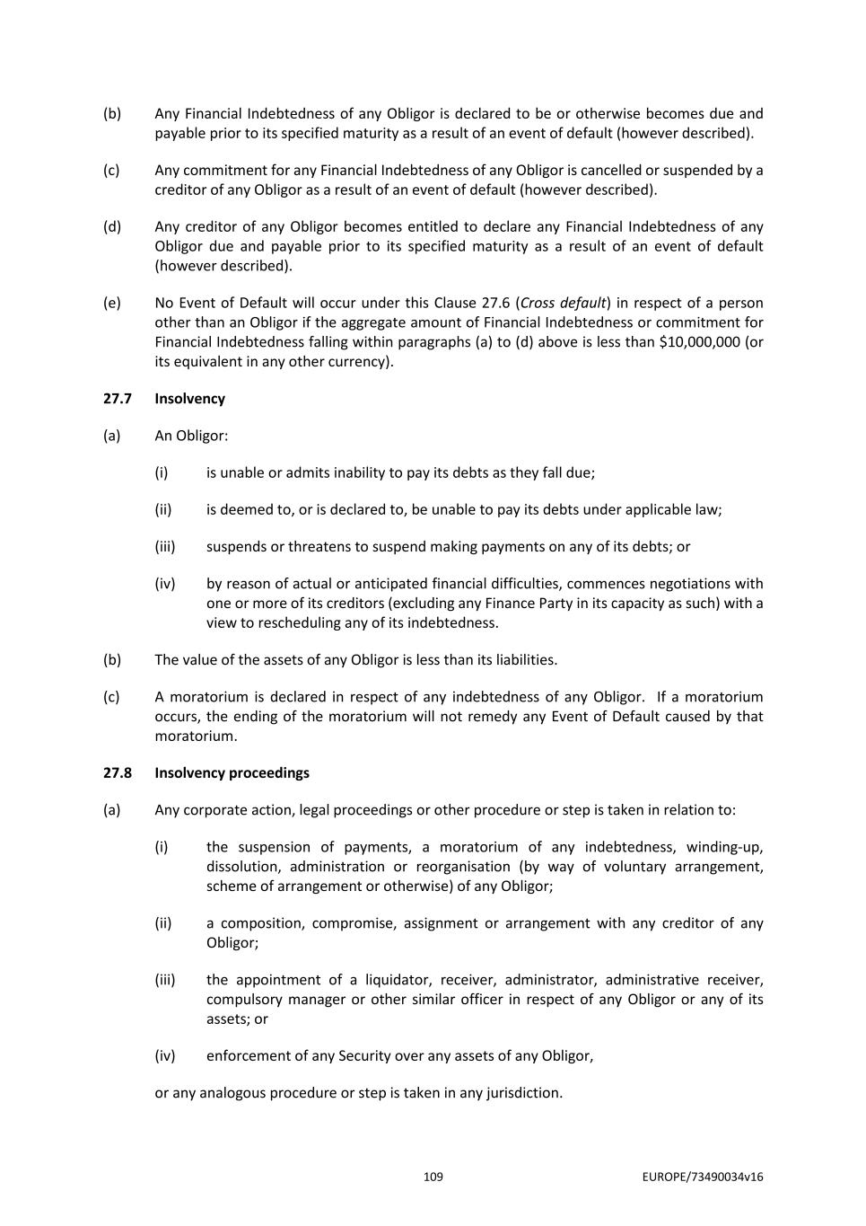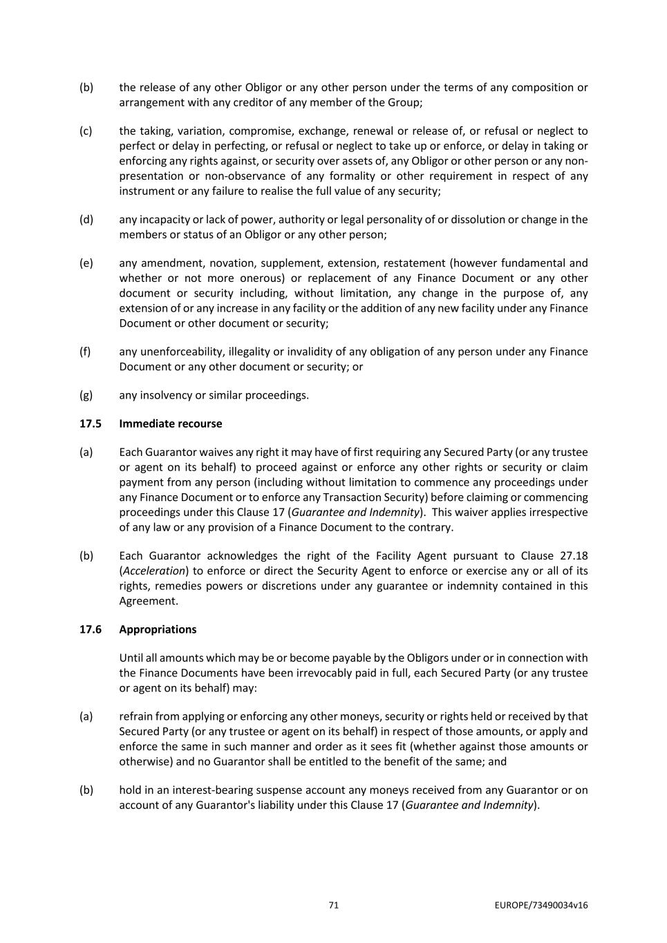 71 EUROPE/73490034v16 (b) the release of any other Obligor or any other person under the terms of any composition or arrangement with any creditor of any member of the Group; (c) the taking, variation, compromise, exchange, renewal or release of, or refusal or neglect to perfect or delay in perfecting, or refusal or neglect to take up or enforce, or delay in taking or enforcing any rights against, or security over assets of, any Obligor or other person or any non- presentation or non-observance of any formality or other requirement in respect of any instrument or any failure to realise the full value of any security; (d) any incapacity or lack of power, authority or legal personality of or dissolution or change in the members or status of an Obligor or any other person; (e) any amendment, novation, supplement, extension, restatement (however fundamental and whether or not more onerous) or replacement of any Finance Document or any other document or security including, without limitation, any change in the purpose of, any extension of or any increase in any facility or the addition of any new facility under any Finance Document or other document or security; (f) any unenforceability, illegality or invalidity of any obligation of any person under any Finance Document or any other document or security; or (g) any insolvency or similar proceedings. 17.5 Immediate recourse (a) Each Guarantor waives any right it may have of first requiring any Secured Party (or any trustee or agent on its behalf) to proceed against or enforce any other rights or security or claim payment from any person (including without limitation to commence any proceedings under any Finance Document or to enforce any Transaction Security) before claiming or commencing proceedings under this Clause 17 (Guarantee and Indemnity). This waiver applies irrespective of any law or any provision of a Finance Document to the contrary. (b) Each Guarantor acknowledges the right of the Facility Agent pursuant to Clause 27.18 (Acceleration) to enforce or direct the Security Agent to enforce or exercise any or all of its rights, remedies powers or discretions under any guarantee or indemnity contained in this Agreement. 17.6 Appropriations Until all amounts which may be or become payable by the Obligors under or in connection with the Finance Documents have been irrevocably paid in full, each Secured Party (or any trustee or agent on its behalf) may: (a) refrain from applying or enforcing any other moneys, security or rights held or received by that Secured Party (or any trustee or agent on its behalf) in respect of those amounts, or apply and enforce the same in such manner and order as it sees fit (whether against those amounts or otherwise) and no Guarantor shall be entitled to the benefit of the same; and (b) hold in an interest-bearing suspense account any moneys received from any Guarantor or on account of any Guarantor's liability under this Clause 17 (Guarantee and Indemnity).