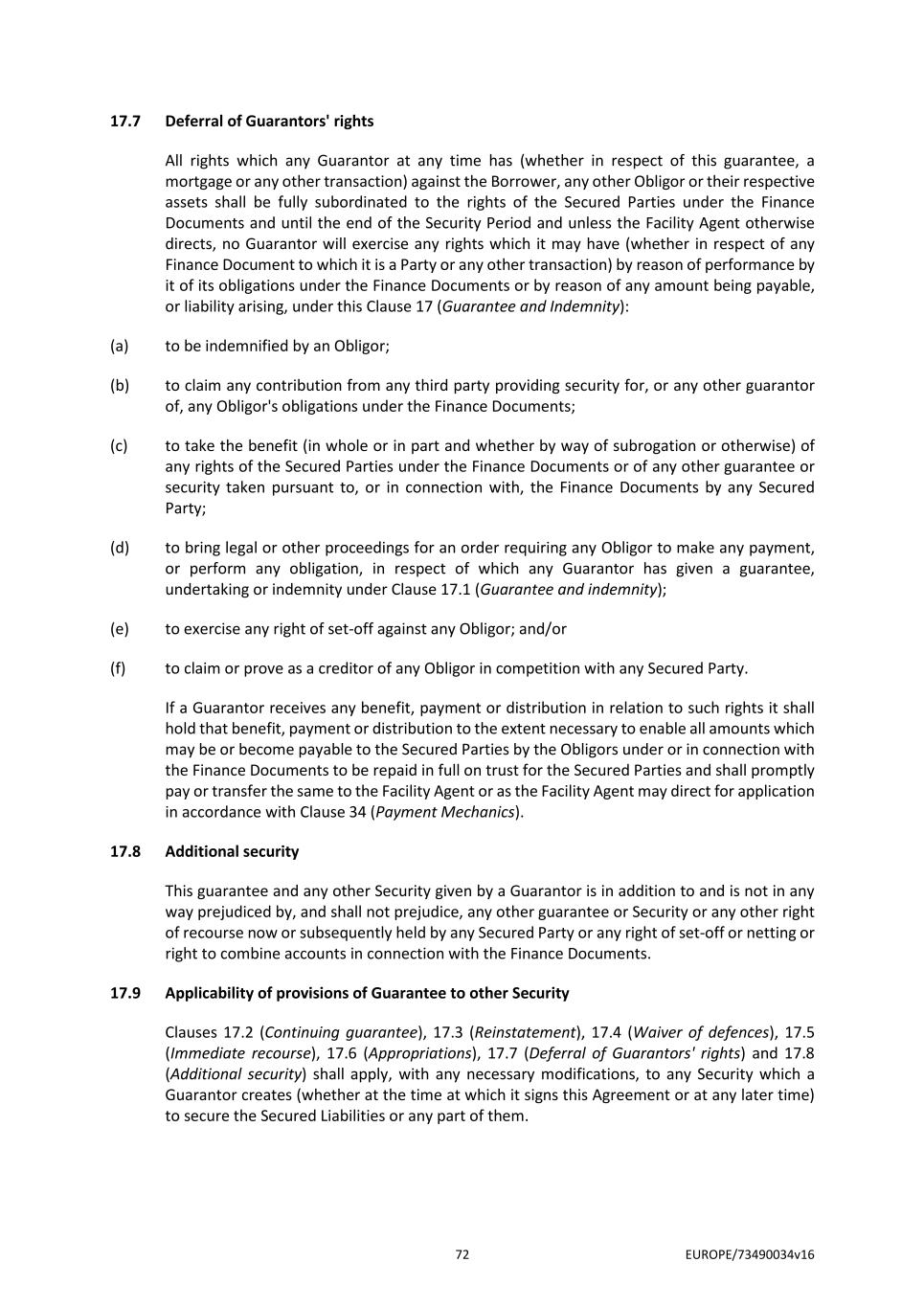 72 EUROPE/73490034v16 17.7 Deferral of Guarantors' rights All rights which any Guarantor at any time has (whether in respect of this guarantee, a mortgage or any other transaction) against the Borrower, any other Obligor or their respective assets shall be fully subordinated to the rights of the Secured Parties under the Finance Documents and until the end of the Security Period and unless the Facility Agent otherwise directs, no Guarantor will exercise any rights which it may have (whether in respect of any Finance Document to which it is a Party or any other transaction) by reason of performance by it of its obligations under the Finance Documents or by reason of any amount being payable, or liability arising, under this Clause 17 (Guarantee and Indemnity): (a) to be indemnified by an Obligor; (b) to claim any contribution from any third party providing security for, or any other guarantor of, any Obligor's obligations under the Finance Documents; (c) to take the benefit (in whole or in part and whether by way of subrogation or otherwise) of any rights of the Secured Parties under the Finance Documents or of any other guarantee or security taken pursuant to, or in connection with, the Finance Documents by any Secured Party; (d) to bring legal or other proceedings for an order requiring any Obligor to make any payment, or perform any obligation, in respect of which any Guarantor has given a guarantee, undertaking or indemnity under Clause 17.1 (Guarantee and indemnity); (e) to exercise any right of set-off against any Obligor; and/or (f) to claim or prove as a creditor of any Obligor in competition with any Secured Party. If a Guarantor receives any benefit, payment or distribution in relation to such rights it shall hold that benefit, payment or distribution to the extent necessary to enable all amounts which may be or become payable to the Secured Parties by the Obligors under or in connection with the Finance Documents to be repaid in full on trust for the Secured Parties and shall promptly pay or transfer the same to the Facility Agent or as the Facility Agent may direct for application in accordance with Clause 34 (Payment Mechanics). 17.8 Additional security This guarantee and any other Security given by a Guarantor is in addition to and is not in any way prejudiced by, and shall not prejudice, any other guarantee or Security or any other right of recourse now or subsequently held by any Secured Party or any right of set-off or netting or right to combine accounts in connection with the Finance Documents. 17.9 Applicability of provisions of Guarantee to other Security Clauses 17.2 (Continuing guarantee), 17.3 (Reinstatement), 17.4 (Waiver of defences), 17.5 (Immediate recourse), 17.6 (Appropriations), 17.7 (Deferral of Guarantors' rights) and 17.8 (Additional security) shall apply, with any necessary modifications, to any Security which a Guarantor creates (whether at the time at which it signs this Agreement or at any later time) to secure the Secured Liabilities or any part of them.