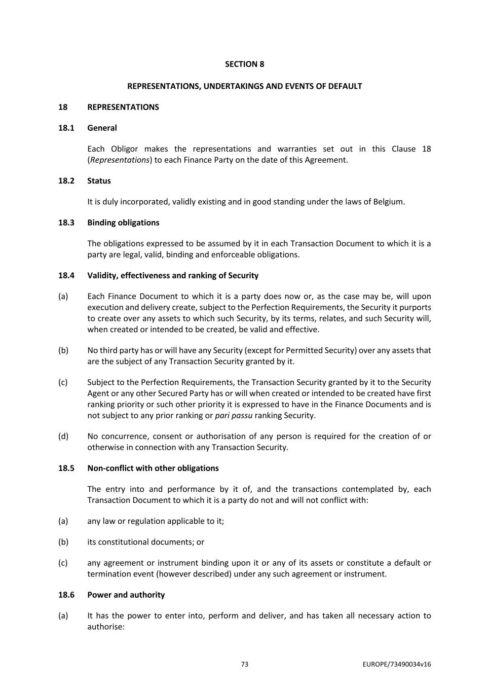73 EUROPE/73490034v16 SECTION 8 REPRESENTATIONS, UNDERTAKINGS AND EVENTS OF DEFAULT 18 REPRESENTATIONS 18.1 General Each Obligor makes the representations and warranties set out in this Clause 18 (Representations) to each Finance Party on the date of this Agreement. 18.2 Status It is duly incorporated, validly existing and in good standing under the laws of Belgium. 18.3 Binding obligations The obligations expressed to be assumed by it in each Transaction Document to which it is a party are legal, valid, binding and enforceable obligations. 18.4 Validity, effectiveness and ranking of Security (a) Each Finance Document to which it is a party does now or, as the case may be, will upon execution and delivery create, subject to the Perfection Requirements, the Security it purports to create over any assets to which such Security, by its terms, relates, and such Security will, when created or intended to be created, be valid and effective. (b) No third party has or will have any Security (except for Permitted Security) over any assets that are the subject of any Transaction Security granted by it. (c) Subject to the Perfection Requirements, the Transaction Security granted by it to the Security Agent or any other Secured Party has or will when created or intended to be created have first ranking priority or such other priority it is expressed to have in the Finance Documents and is not subject to any prior ranking or pari passu ranking Security. (d) No concurrence, consent or authorisation of any person is required for the creation of or otherwise in connection with any Transaction Security. 18.5 Non-conflict with other obligations The entry into and performance by it of, and the transactions contemplated by, each Transaction Document to which it is a party do not and will not conflict with: (a) any law or regulation applicable to it; (b) its constitutional documents; or (c) any agreement or instrument binding upon it or any of its assets or constitute a default or termination event (however described) under any such agreement or instrument. 18.6 Power and authority (a) It has the power to enter into, perform and deliver, and has taken all necessary action to authorise: