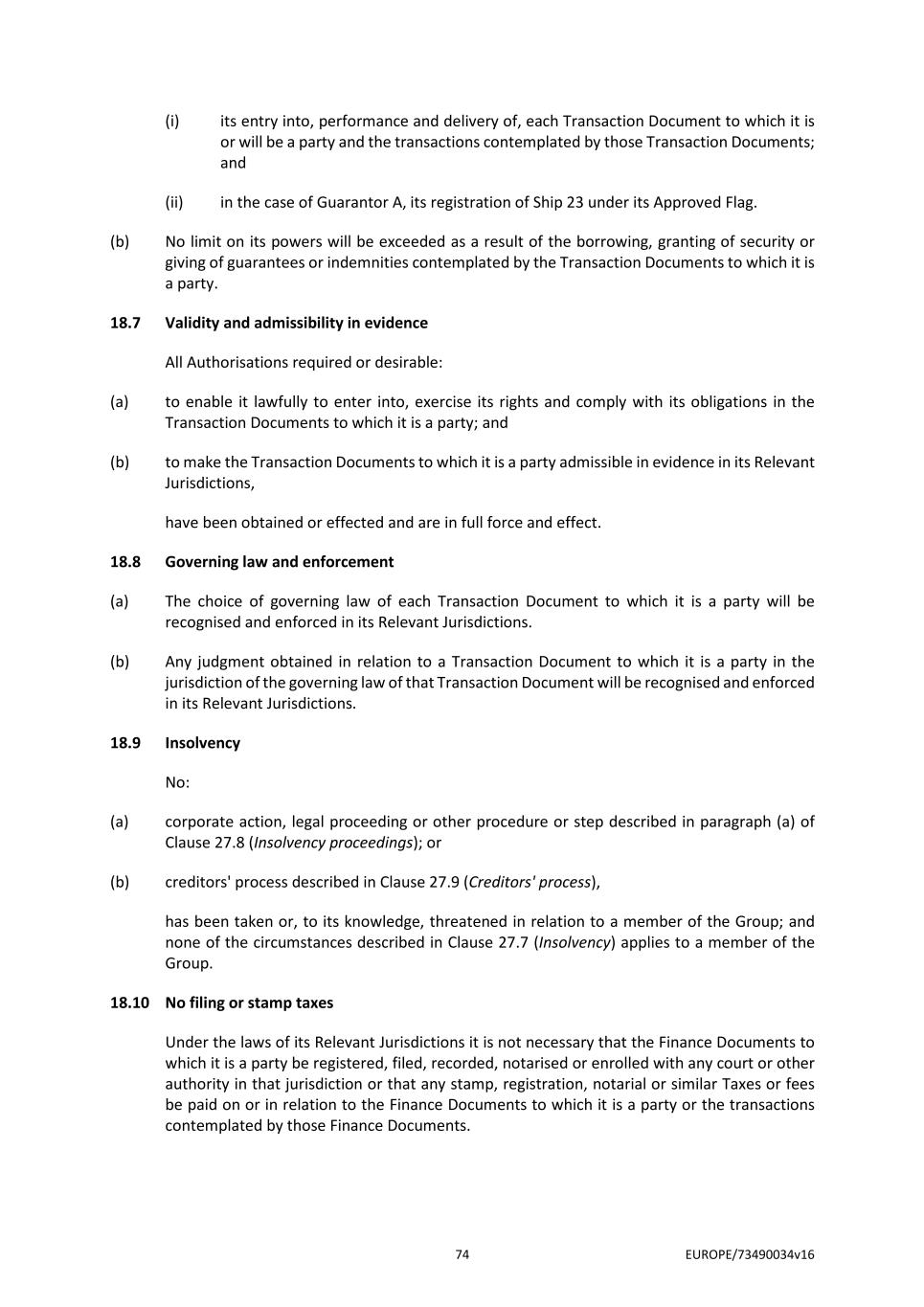 74 EUROPE/73490034v16 (i) its entry into, performance and delivery of, each Transaction Document to which it is or will be a party and the transactions contemplated by those Transaction Documents; and (ii) in the case of Guarantor A, its registration of Ship 23 under its Approved Flag. (b) No limit on its powers will be exceeded as a result of the borrowing, granting of security or giving of guarantees or indemnities contemplated by the Transaction Documents to which it is a party. 18.7 Validity and admissibility in evidence All Authorisations required or desirable: (a) to enable it lawfully to enter into, exercise its rights and comply with its obligations in the Transaction Documents to which it is a party; and (b) to make the Transaction Documents to which it is a party admissible in evidence in its Relevant Jurisdictions, have been obtained or effected and are in full force and effect. 18.8 Governing law and enforcement (a) The choice of governing law of each Transaction Document to which it is a party will be recognised and enforced in its Relevant Jurisdictions. (b) Any judgment obtained in relation to a Transaction Document to which it is a party in the jurisdiction of the governing law of that Transaction Document will be recognised and enforced in its Relevant Jurisdictions. 18.9 Insolvency No: (a) corporate action, legal proceeding or other procedure or step described in paragraph (a) of Clause 27.8 (Insolvency proceedings); or (b) creditors' process described in Clause 27.9 (Creditors' process), has been taken or, to its knowledge, threatened in relation to a member of the Group; and none of the circumstances described in Clause 27.7 (Insolvency) applies to a member of the Group. 18.10 No filing or stamp taxes Under the laws of its Relevant Jurisdictions it is not necessary that the Finance Documents to which it is a party be registered, filed, recorded, notarised or enrolled with any court or other authority in that jurisdiction or that any stamp, registration, notarial or similar Taxes or fees be paid on or in relation to the Finance Documents to which it is a party or the transactions contemplated by those Finance Documents.