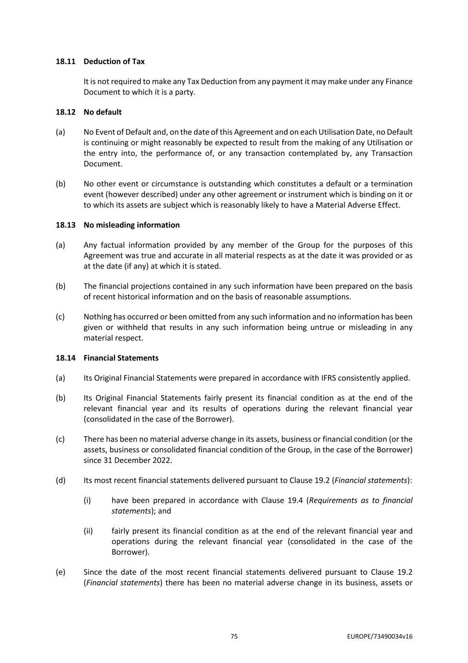 75 EUROPE/73490034v16 18.11 Deduction of Tax It is not required to make any Tax Deduction from any payment it may make under any Finance Document to which it is a party. 18.12 No default (a) No Event of Default and, on the date of this Agreement and on each Utilisation Date, no Default is continuing or might reasonably be expected to result from the making of any Utilisation or the entry into, the performance of, or any transaction contemplated by, any Transaction Document. (b) No other event or circumstance is outstanding which constitutes a default or a termination event (however described) under any other agreement or instrument which is binding on it or to which its assets are subject which is reasonably likely to have a Material Adverse Effect. 18.13 No misleading information (a) Any factual information provided by any member of the Group for the purposes of this Agreement was true and accurate in all material respects as at the date it was provided or as at the date (if any) at which it is stated. (b) The financial projections contained in any such information have been prepared on the basis of recent historical information and on the basis of reasonable assumptions. (c) Nothing has occurred or been omitted from any such information and no information has been given or withheld that results in any such information being untrue or misleading in any material respect. 18.14 Financial Statements (a) Its Original Financial Statements were prepared in accordance with IFRS consistently applied. (b) Its Original Financial Statements fairly present its financial condition as at the end of the relevant financial year and its results of operations during the relevant financial year (consolidated in the case of the Borrower). (c) There has been no material adverse change in its assets, business or financial condition (or the assets, business or consolidated financial condition of the Group, in the case of the Borrower) since 31 December 2022. (d) Its most recent financial statements delivered pursuant to Clause 19.2 (Financial statements): (i) have been prepared in accordance with Clause 19.4 (Requirements as to financial statements); and (ii) fairly present its financial condition as at the end of the relevant financial year and operations during the relevant financial year (consolidated in the case of the Borrower). (e) Since the date of the most recent financial statements delivered pursuant to Clause 19.2 (Financial statements) there has been no material adverse change in its business, assets or